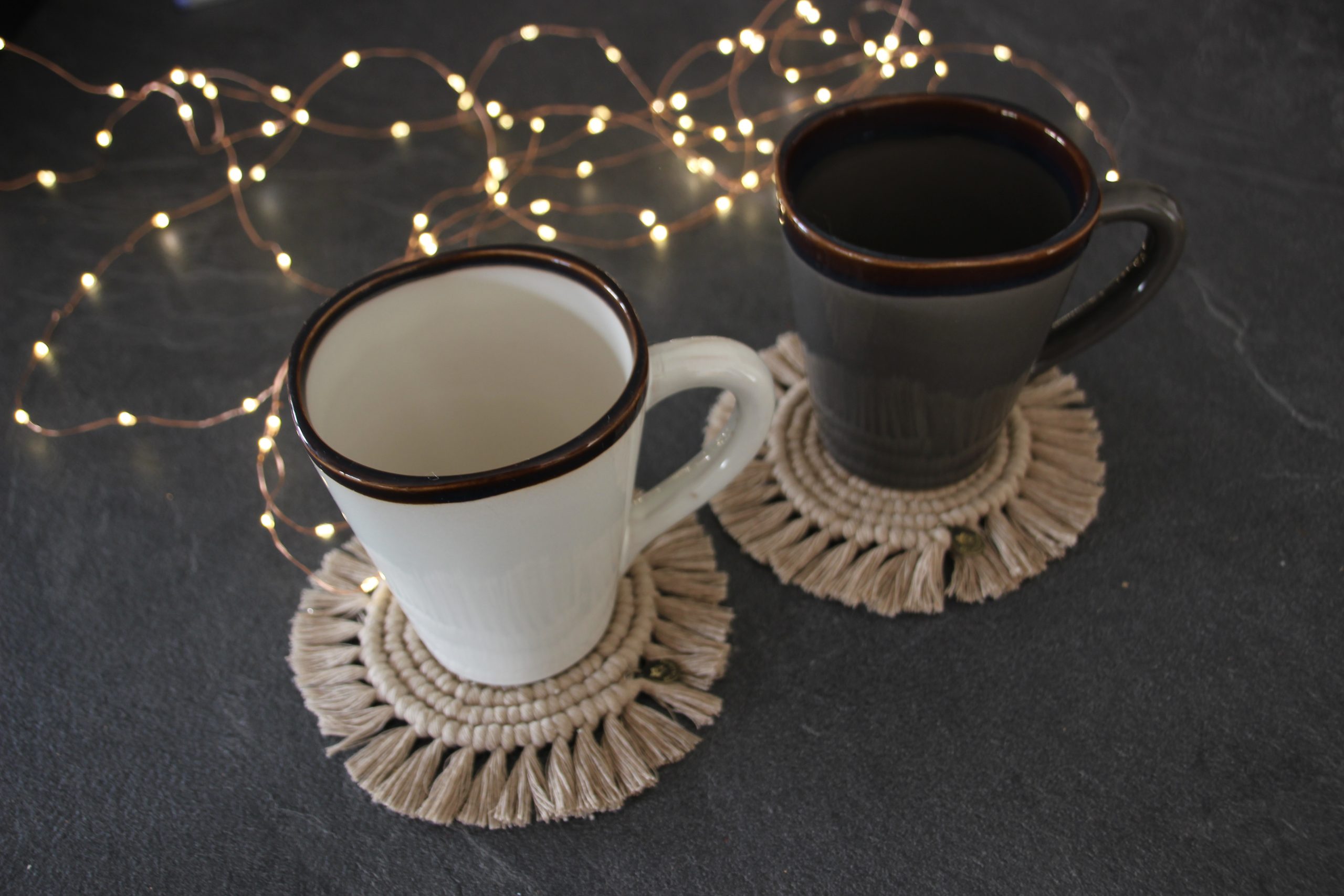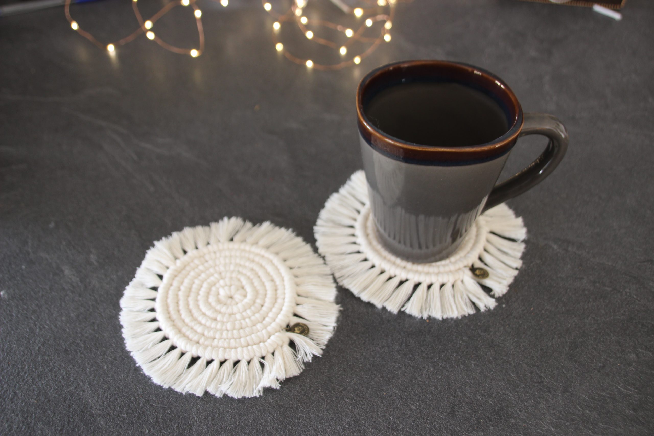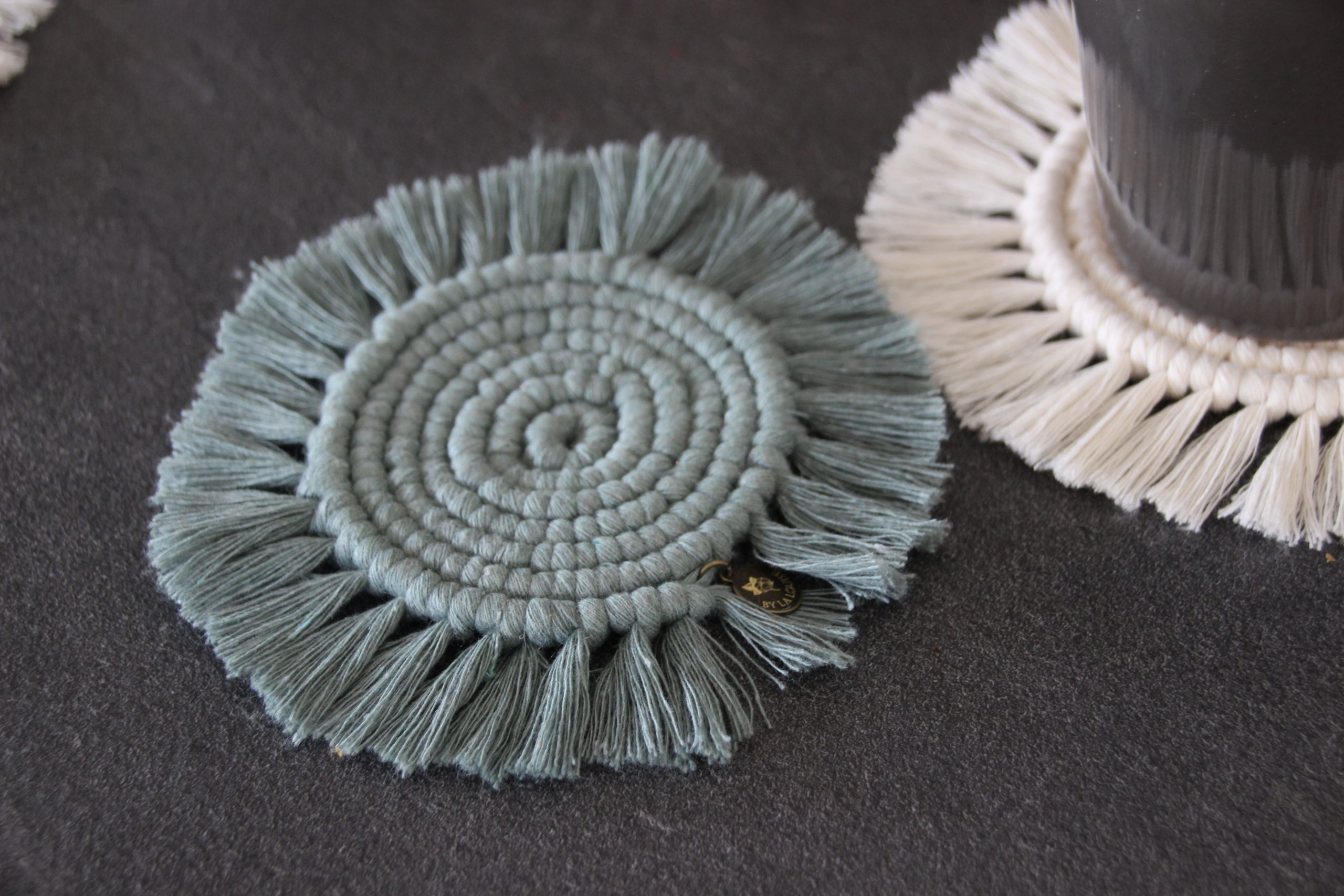 Lot de deux sous-tasses en macramé, en coton recyclé certifié OEKO-TEX, entièrement réalisé par mes soins.
