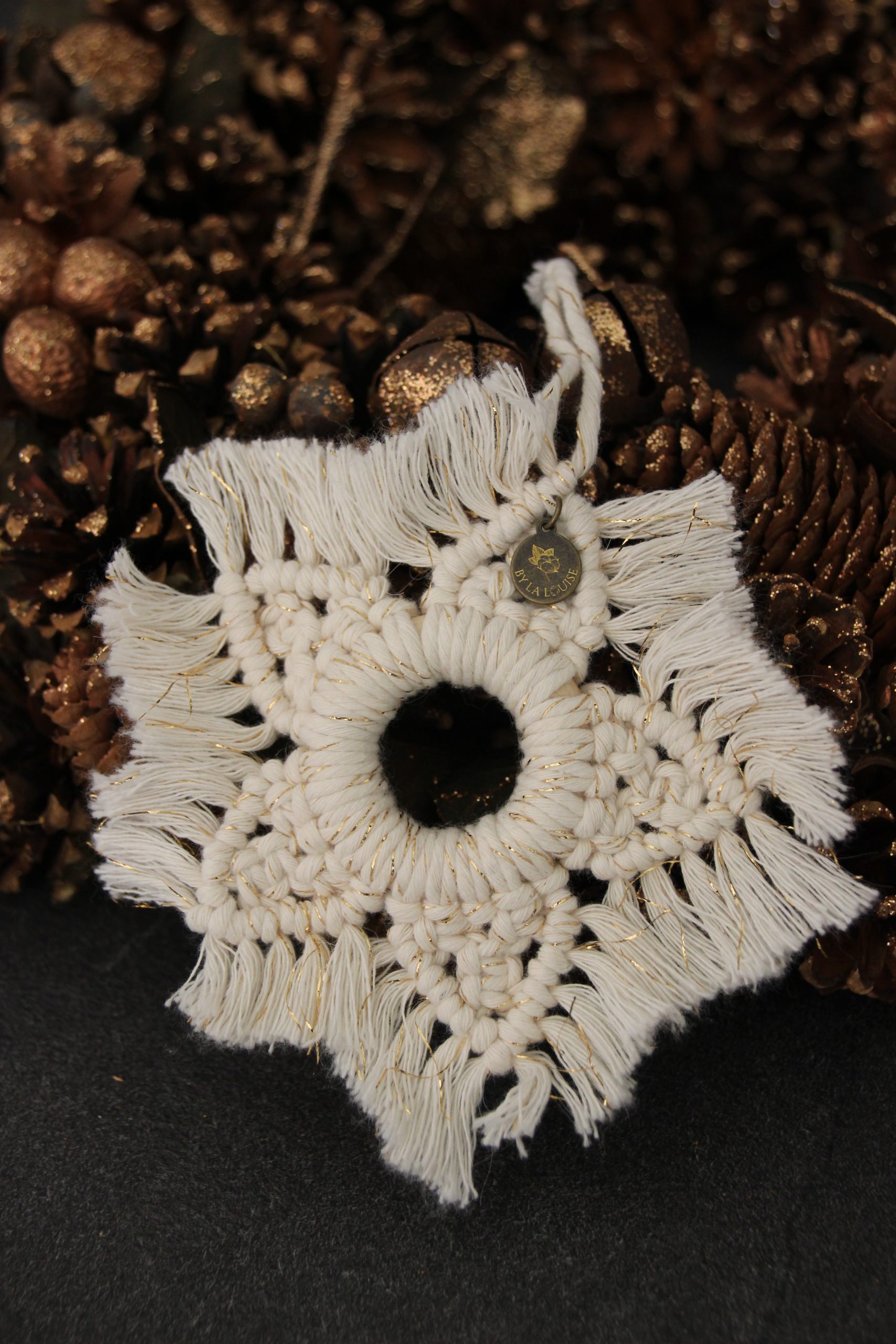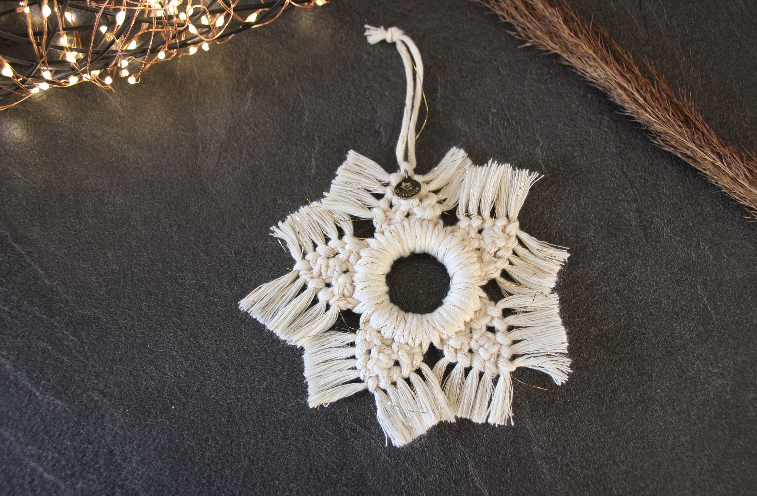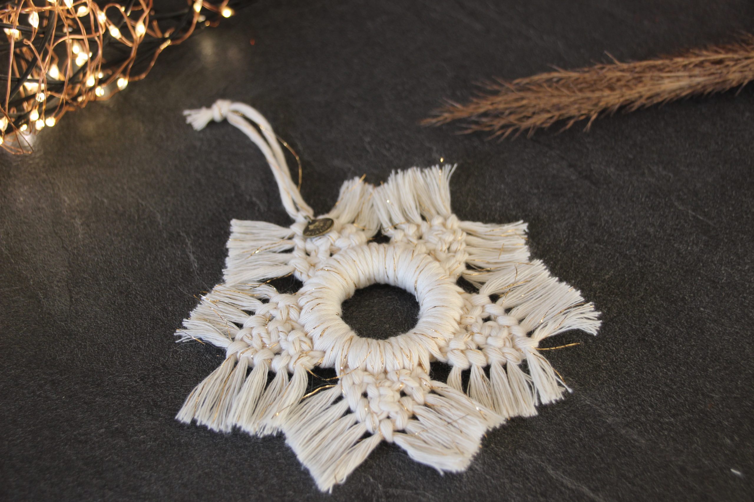 Etoile de Noel en macramé, Etoile à 5 branches, se finissant en pompons, montée sur un anneau en bois