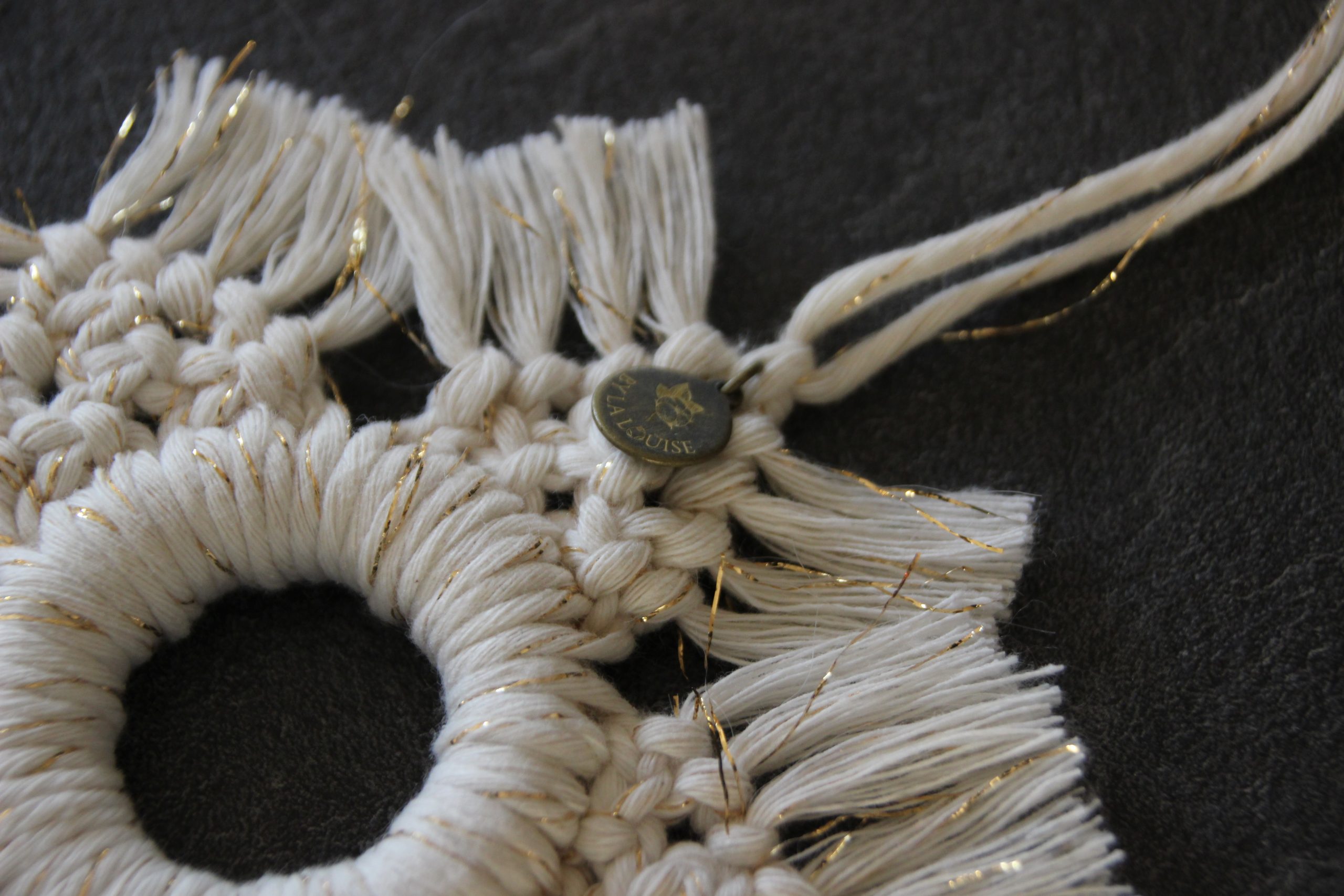 entièrement réalisé à la main par mes soins, avec du coton recyclé certifié OEKO-TEX, de couleur blanc cassé et doré