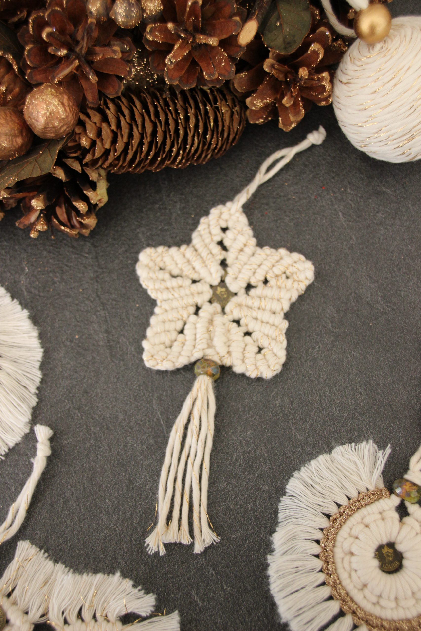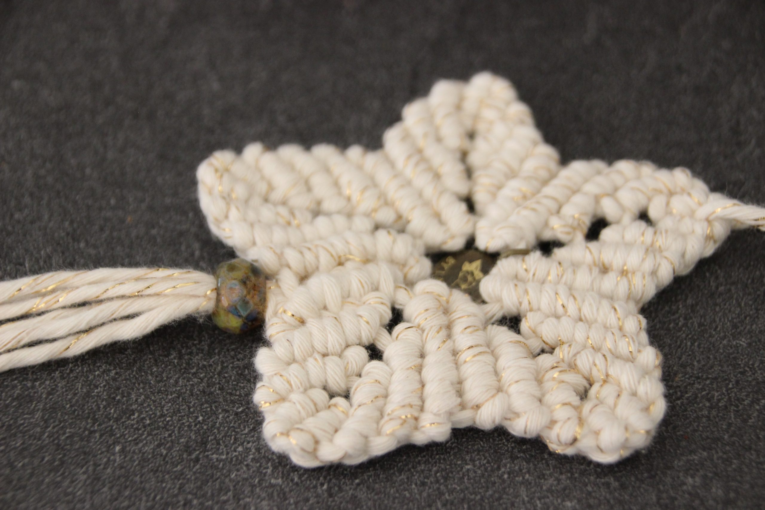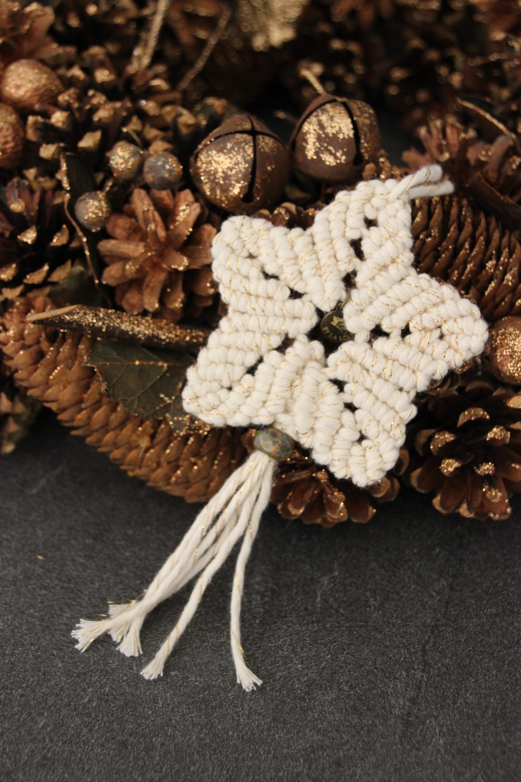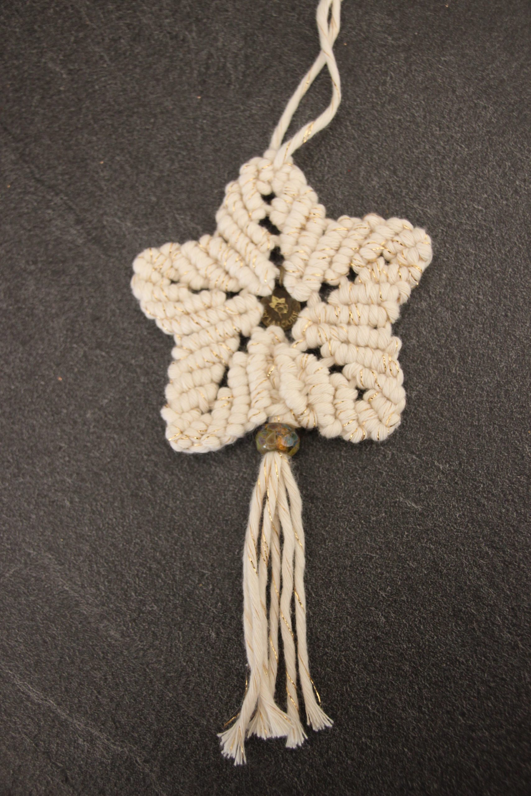 Etoile de Noël à 5 branches, réalisée en macramé, avec du coton blanc et doré, issu des filières de recyclage. Une jolie perle de verre en provenance de république tchèques, rend cette décoration unique !