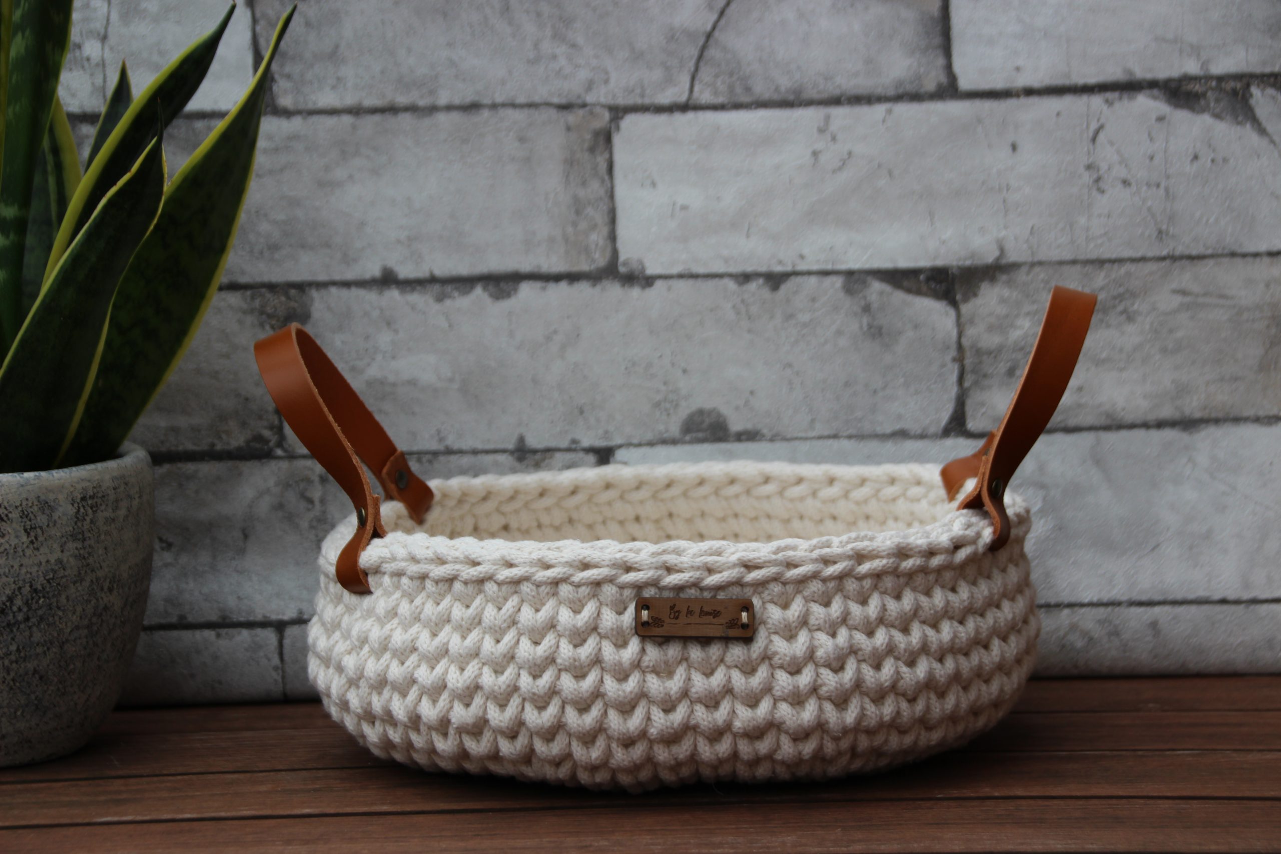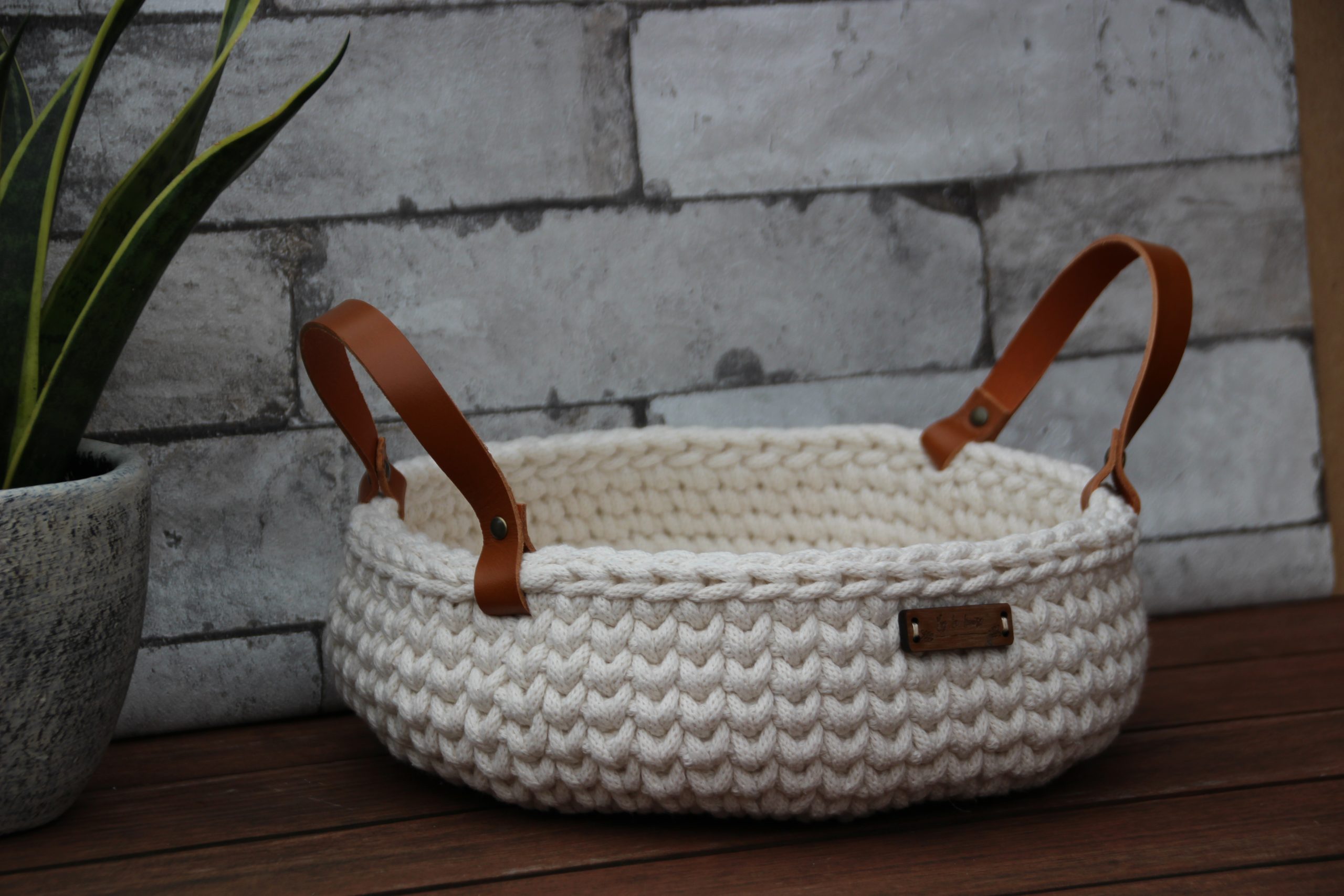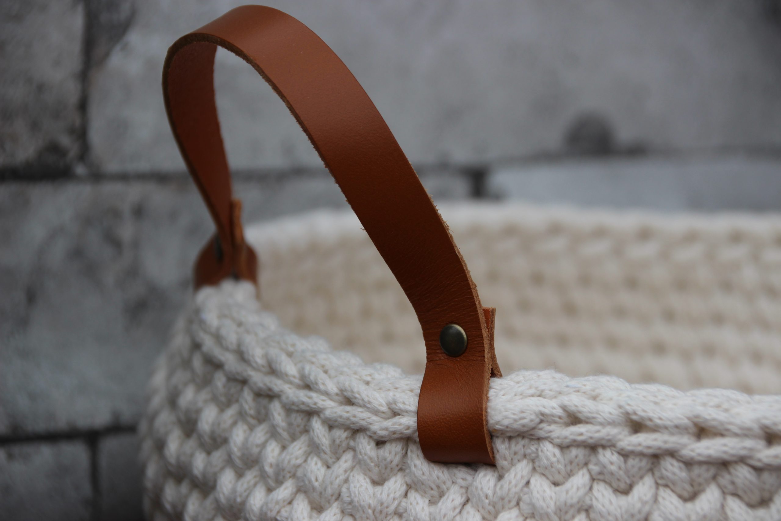Corbeille en coton recyclé certifié OEKO-TEX, entièrement crocheté par mes soins, avec deux jolies anses en cuir.