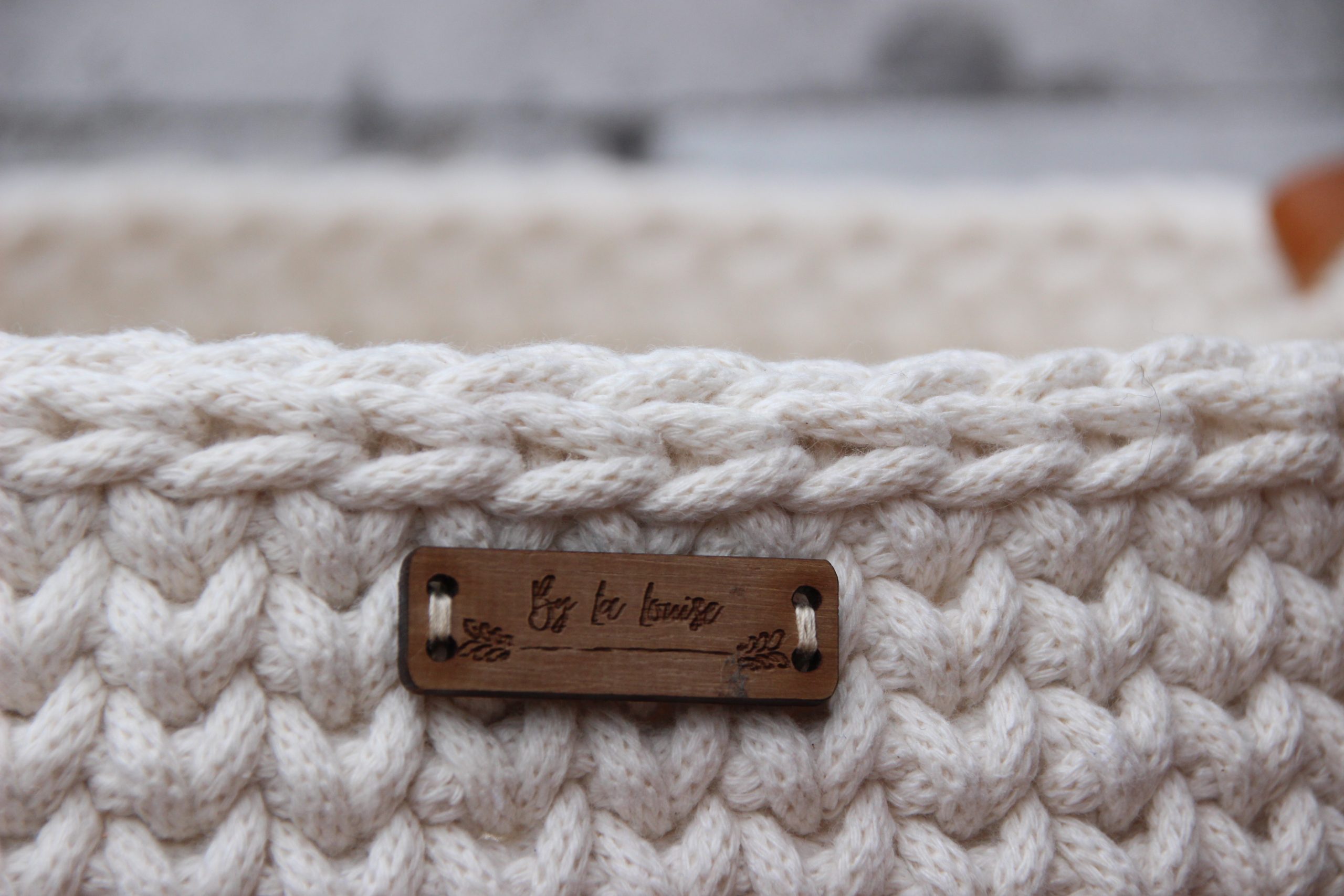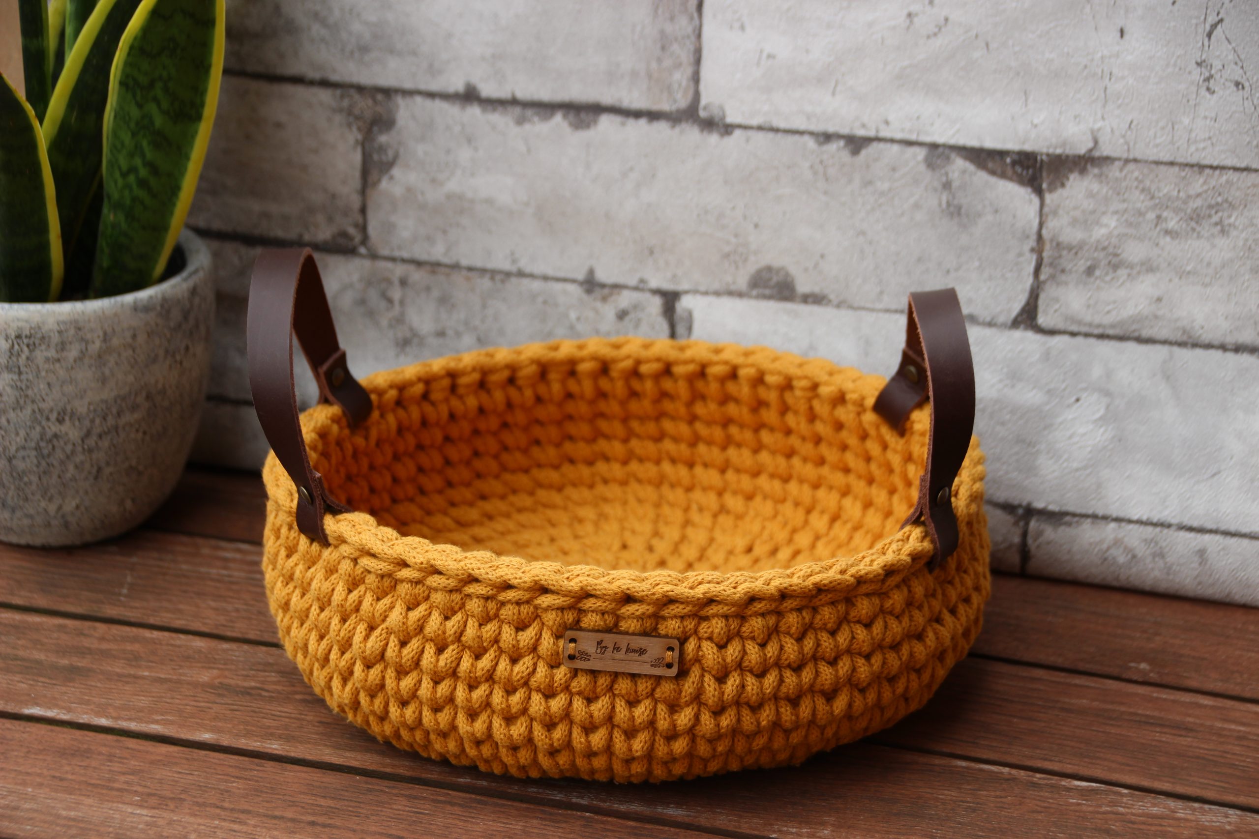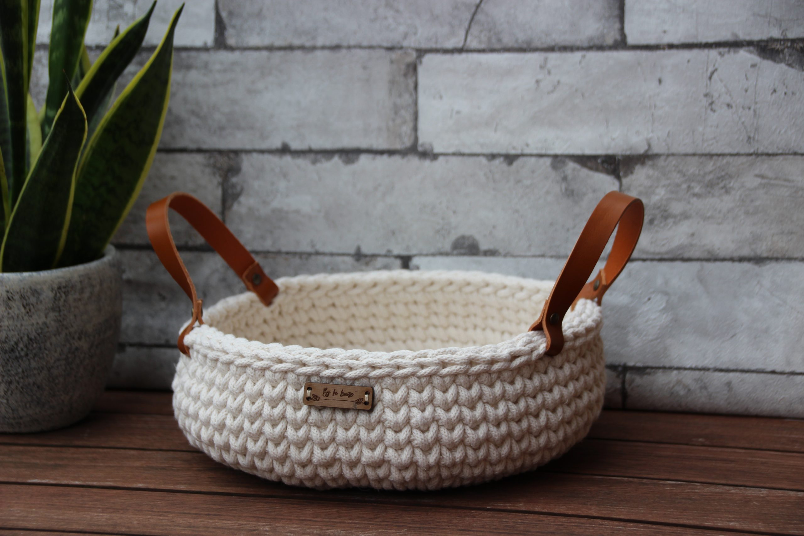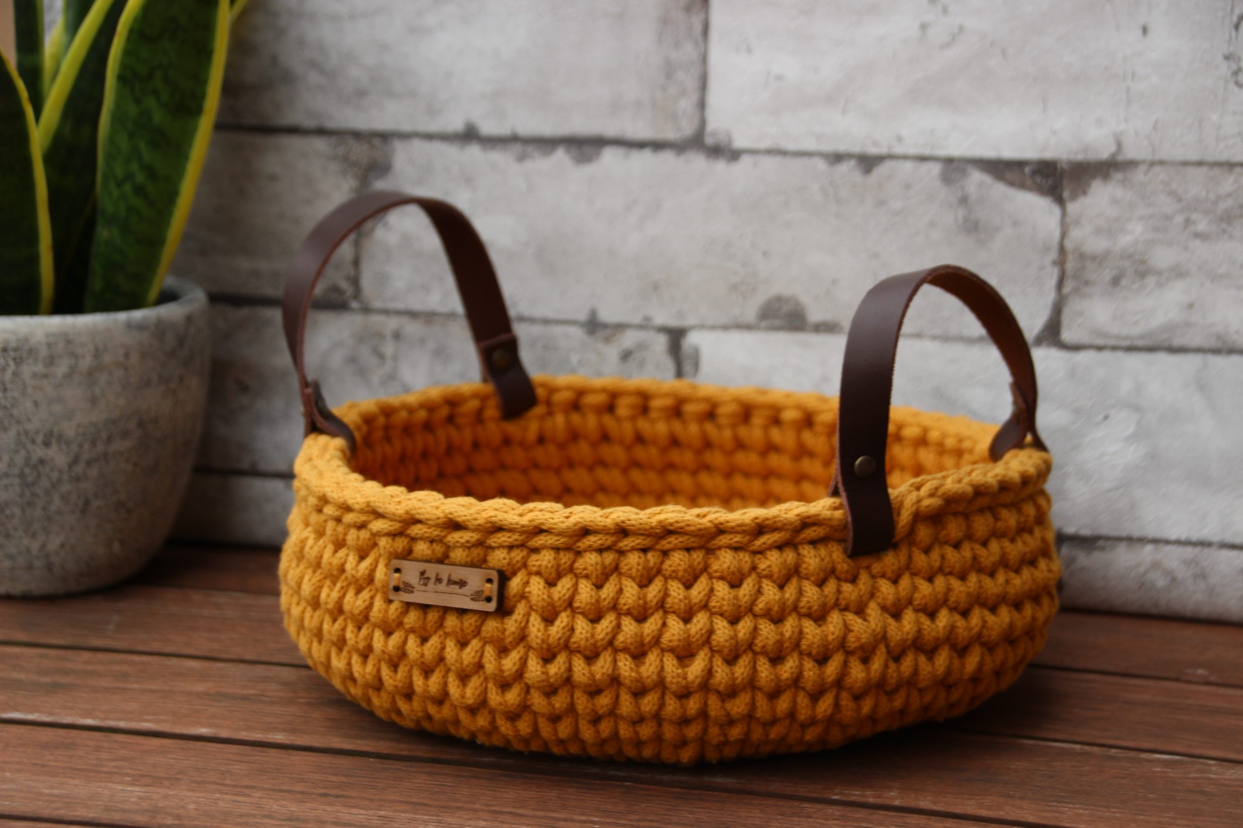 Corbeille en coton recyclé certifié OEKO-TEX, entièrement crocheté par mes soins, avec deux jolies anses en cuir.