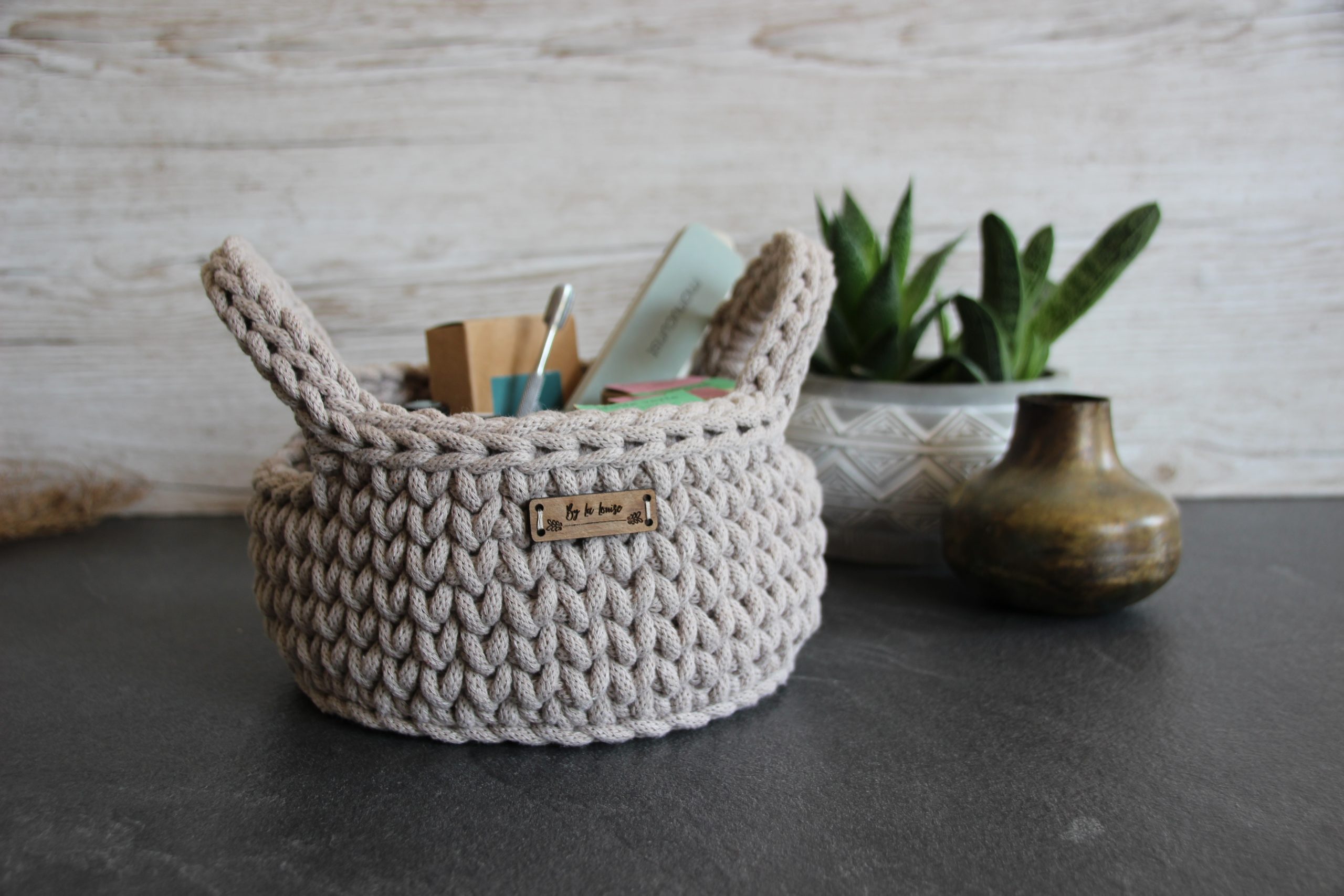 Le panier LOU est un joli petit panier rond à anses, en coton recyclé certifié OEKO-TEX, entièrement crocheté par mes soins.