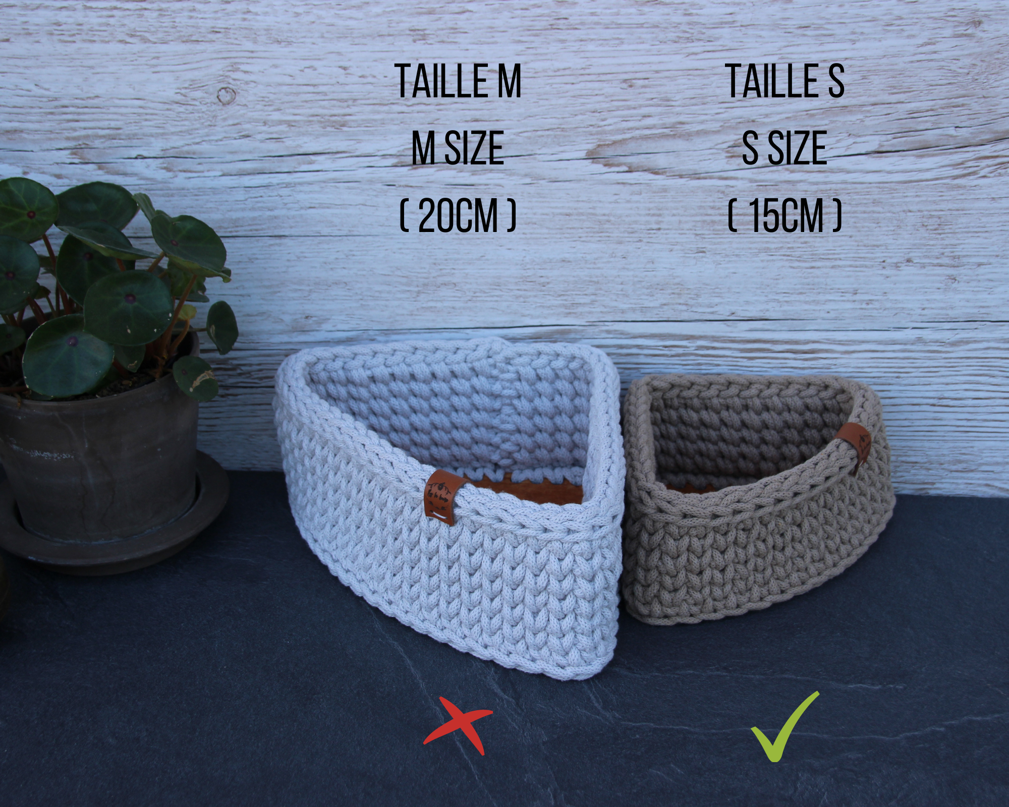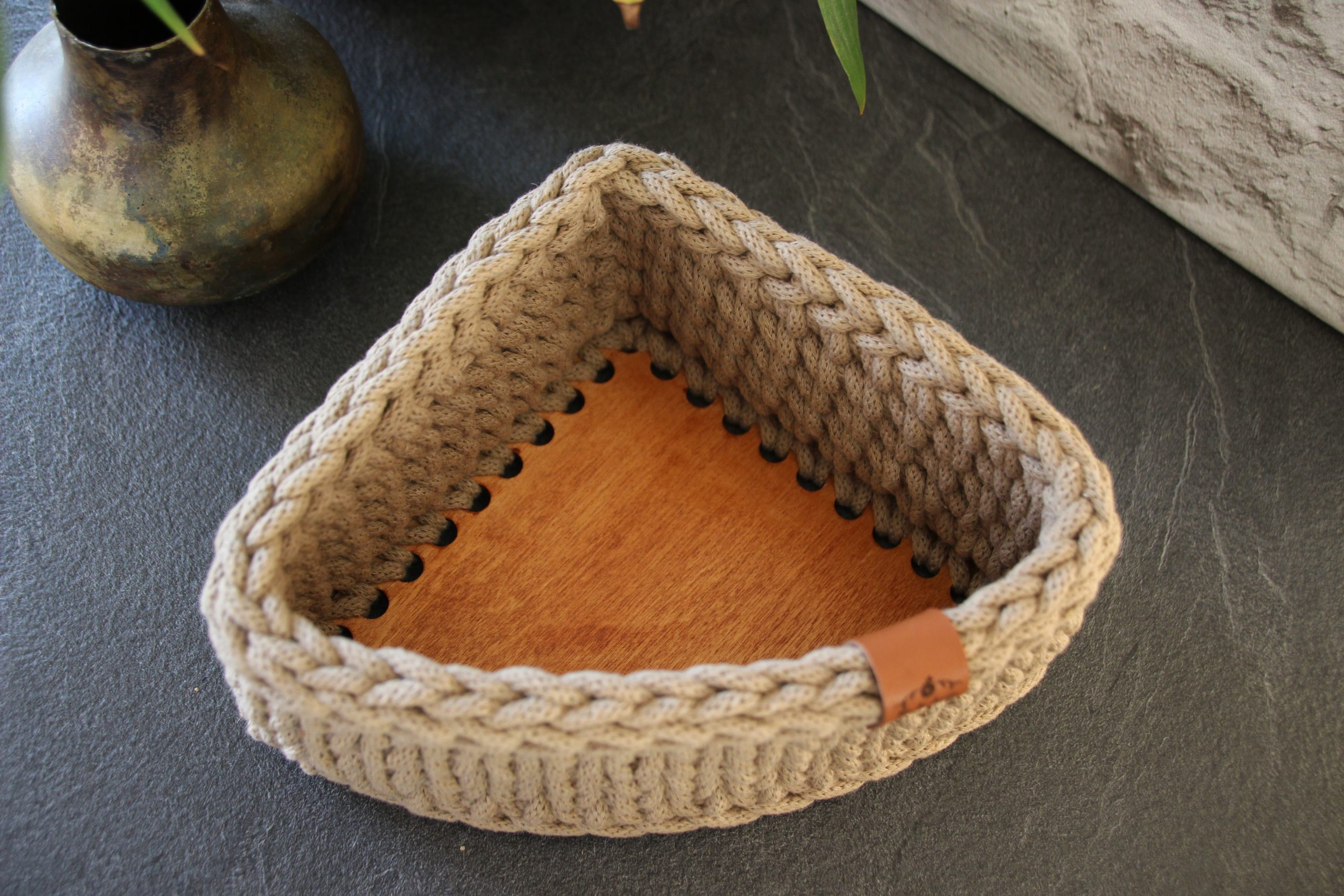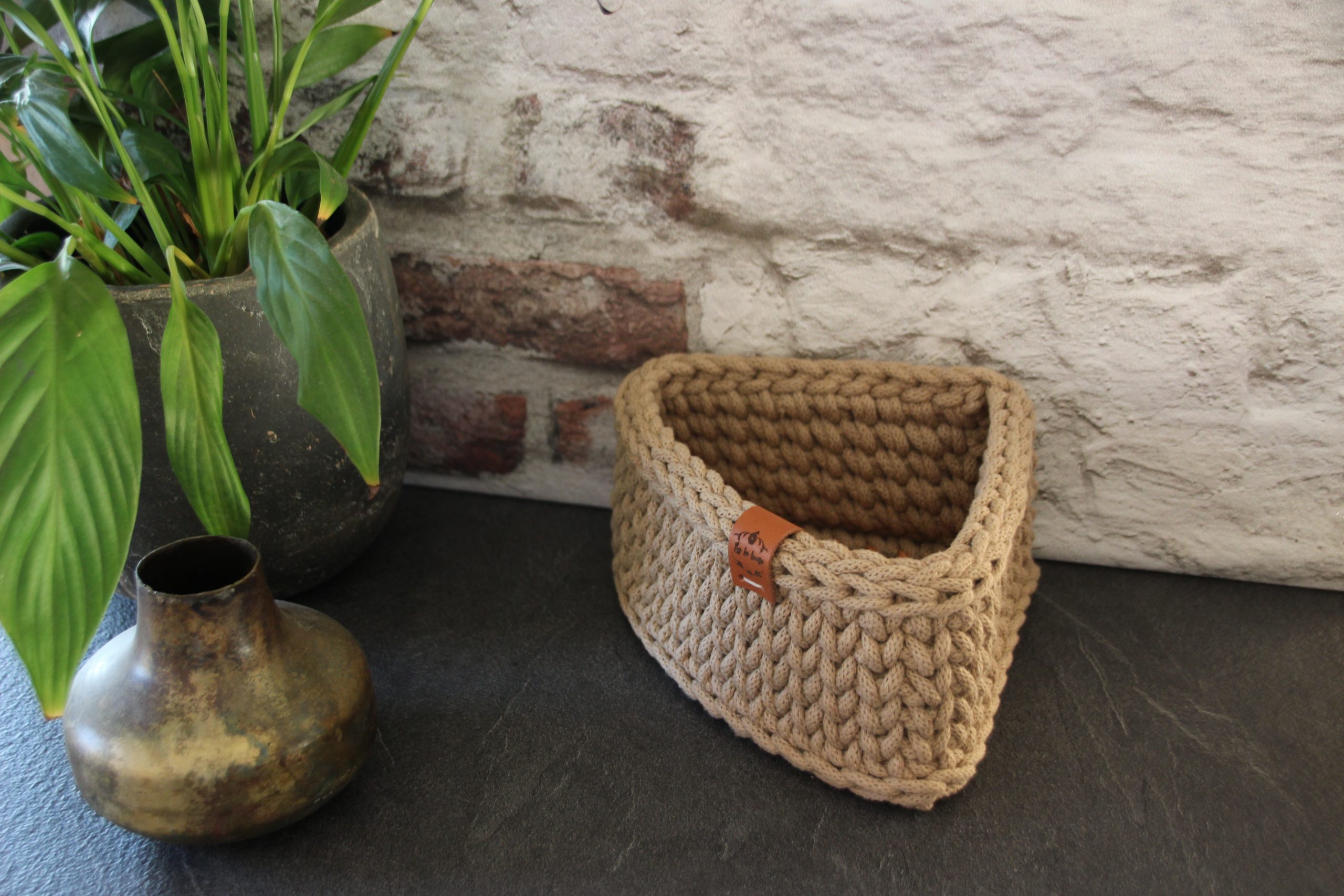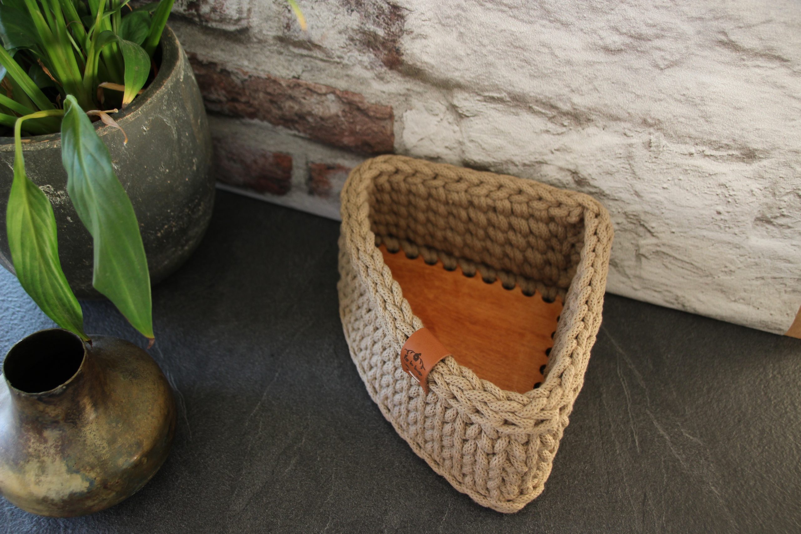 Petit panier d’angle, de forme triangulaire avec une coté en demi cercle, en coton recyclé certifié OEKO-TEX, entièrement crocheté par mes soins, sur un fond en bois couleur acajou.