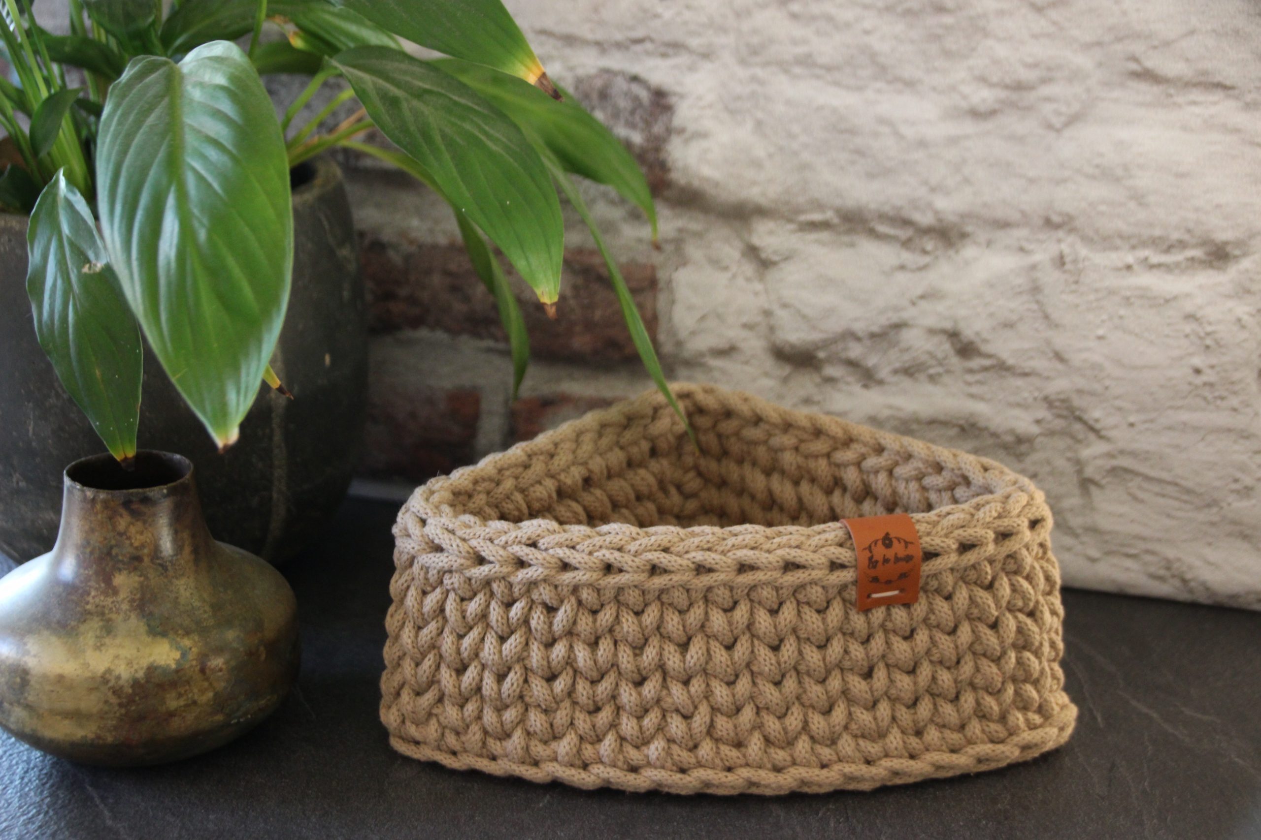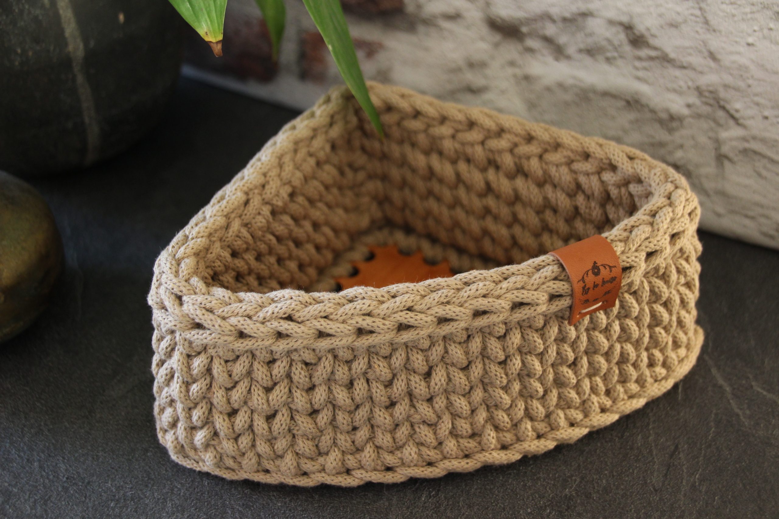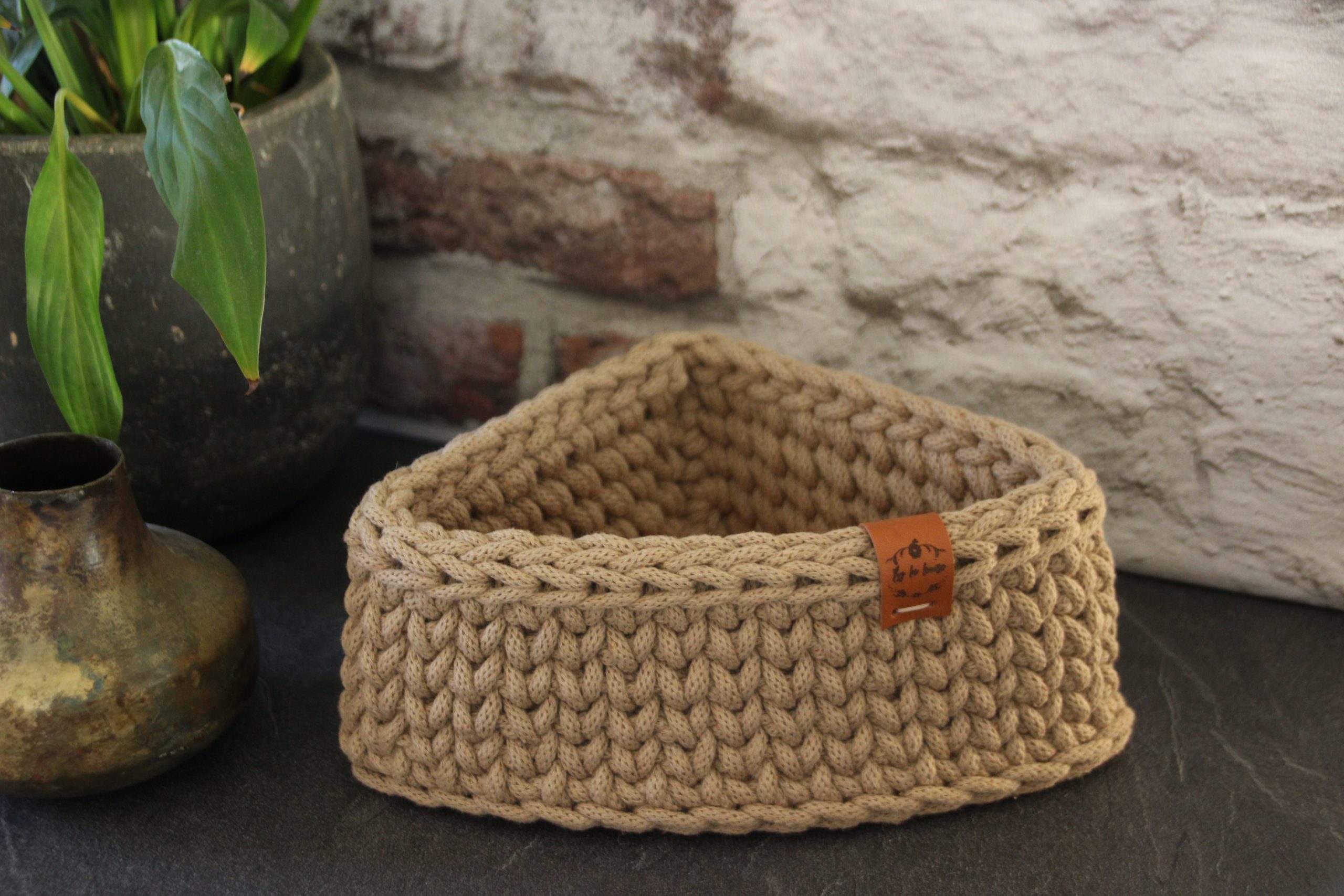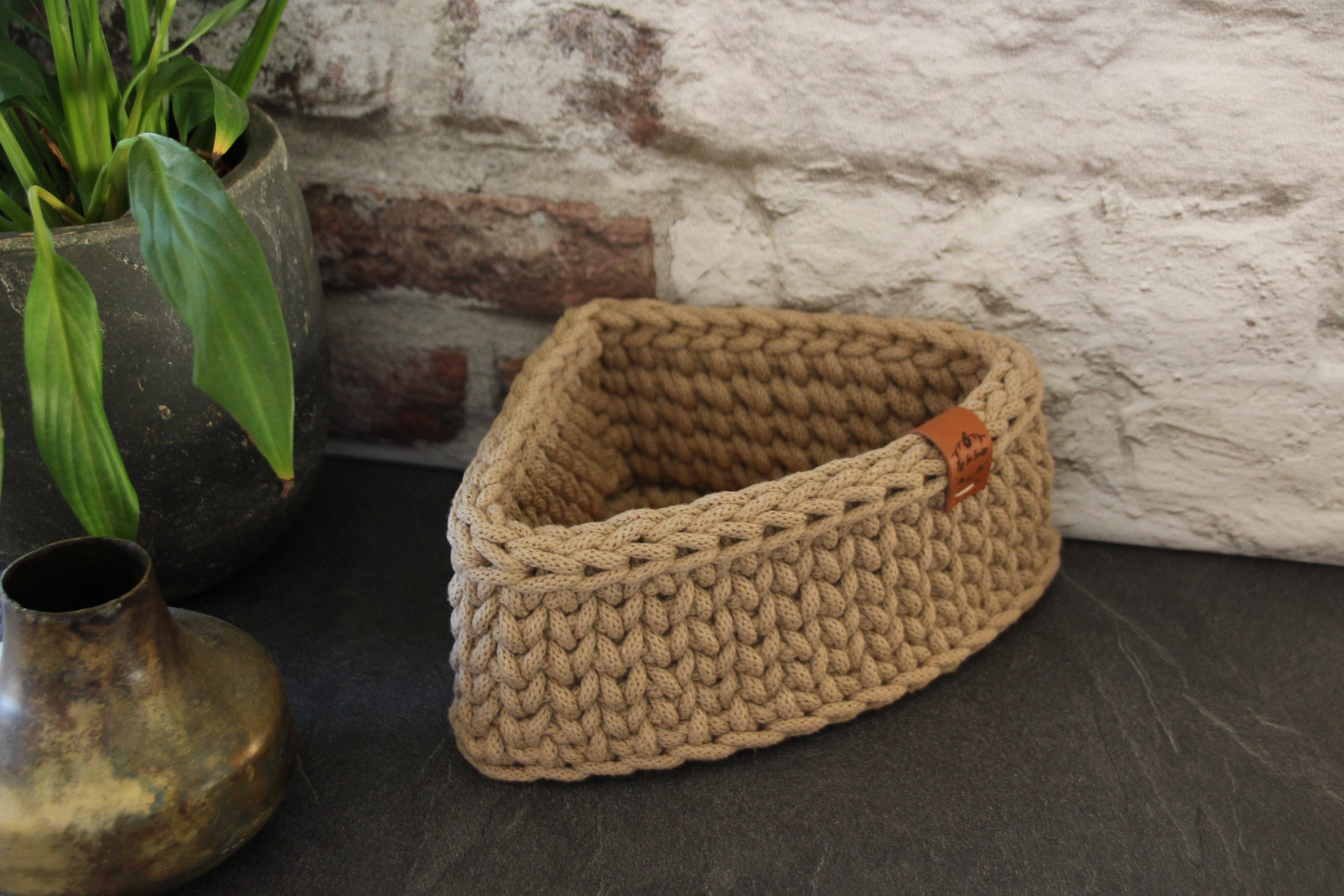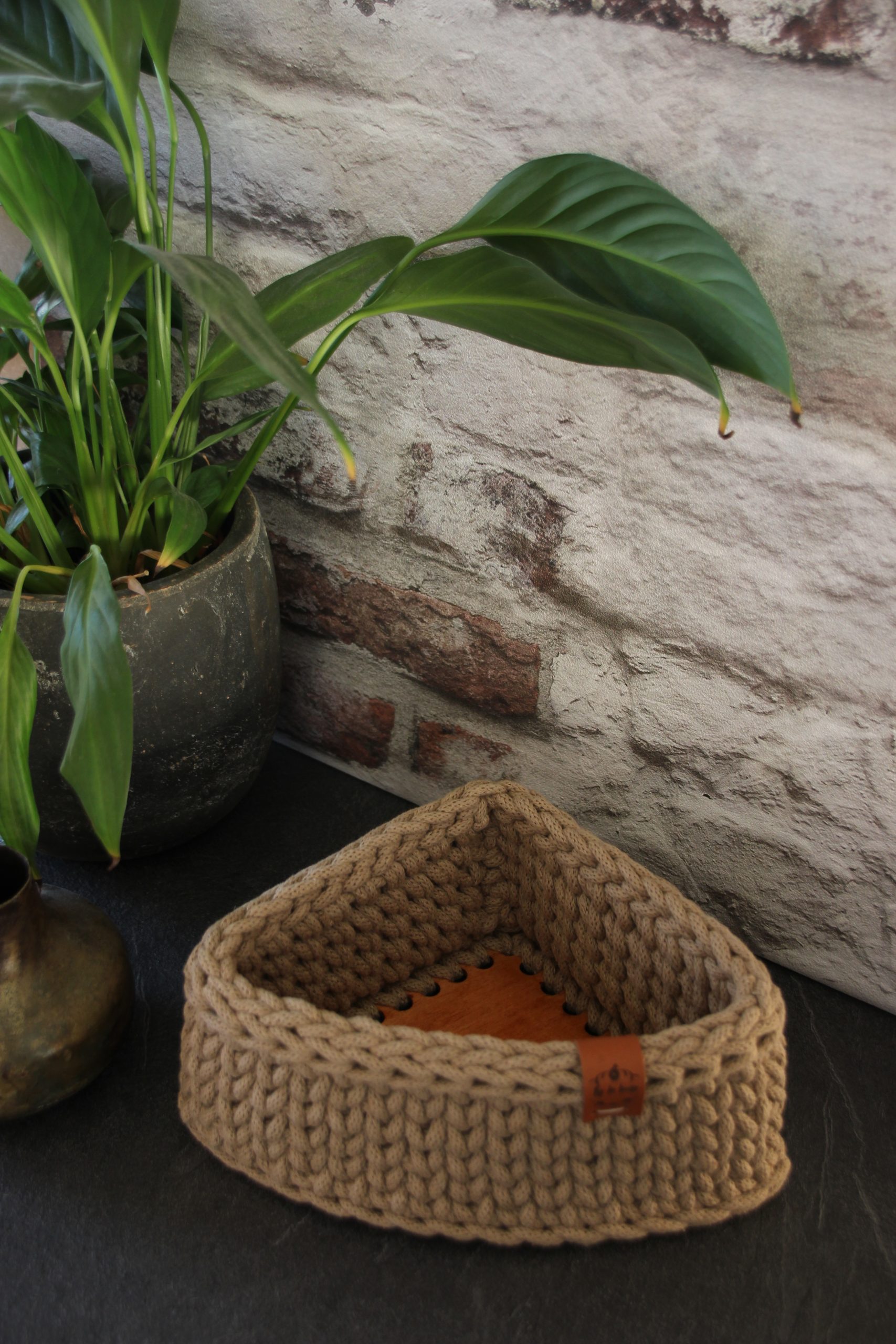 Petit panier d’angle, de forme triangulaire avec une coté en demi cercle, en coton recyclé certifié OEKO-TEX, entièrement crocheté par mes soins, sur un fond en bois couleur acajou.