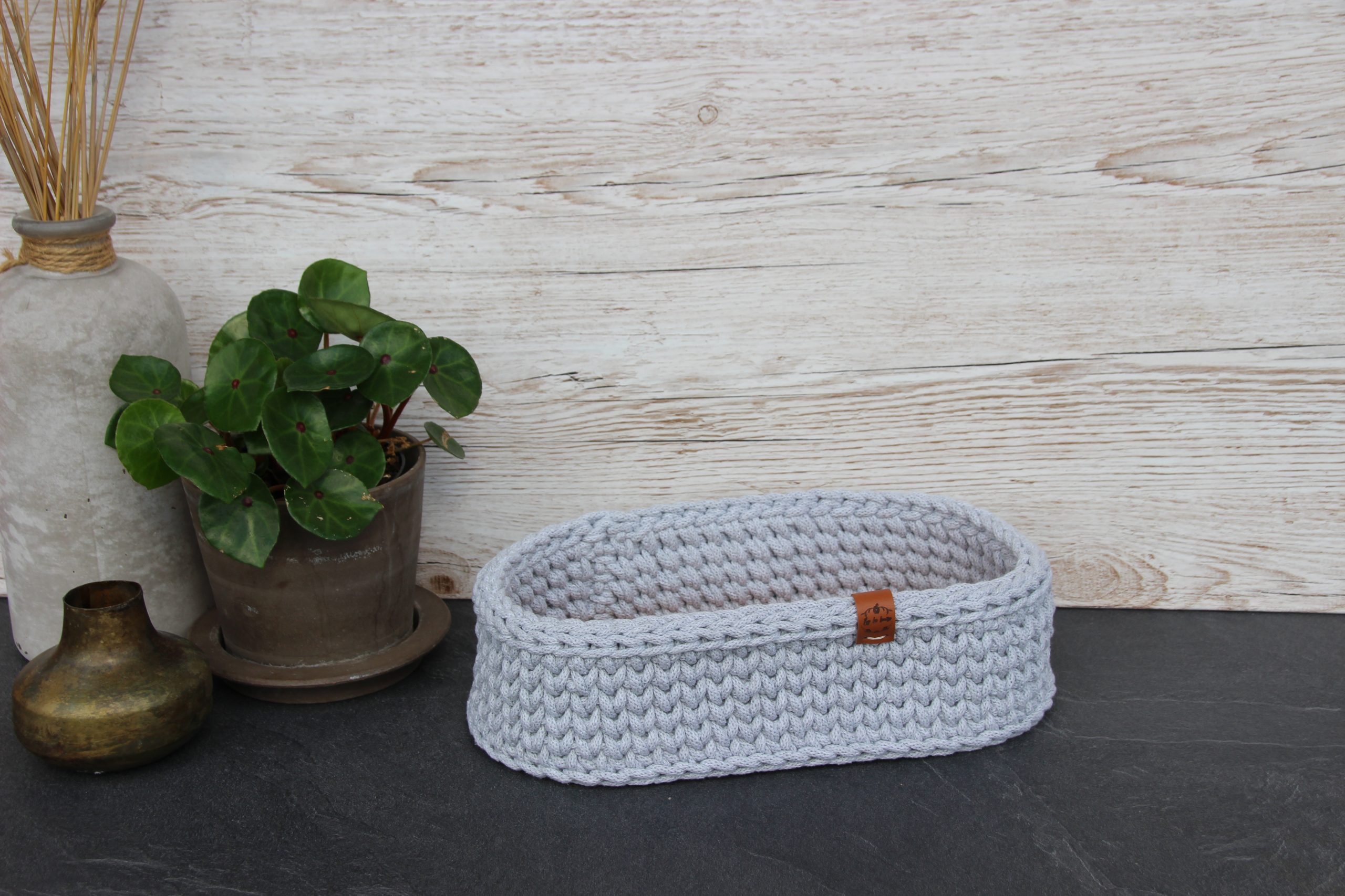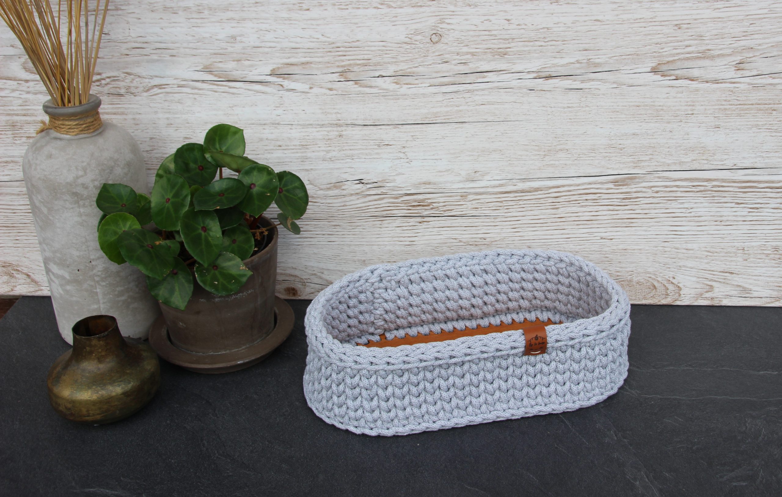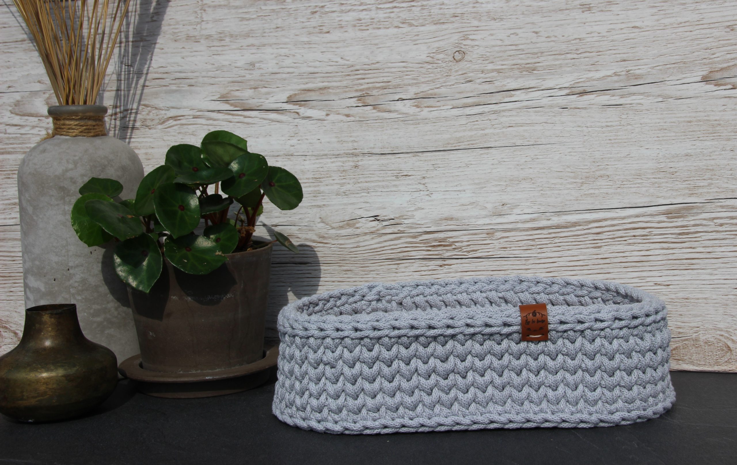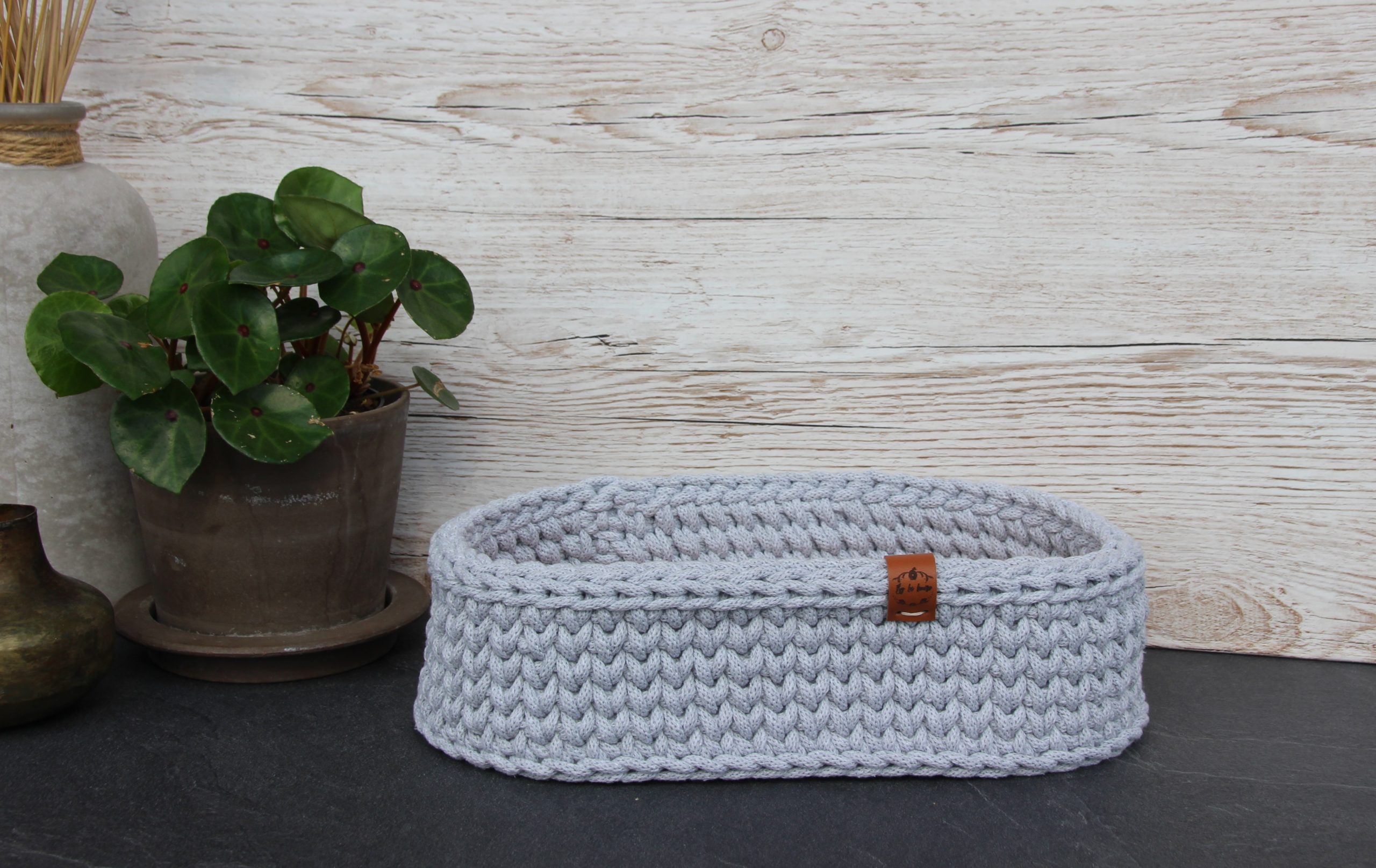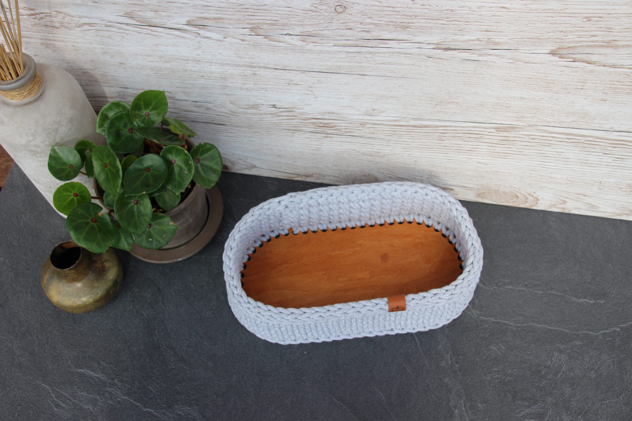 Grand panier ovale, en coton recyclé certifié OEKO-TEX, entièrement crocheté par mes soins, sur un fond en bois couleur acajou.