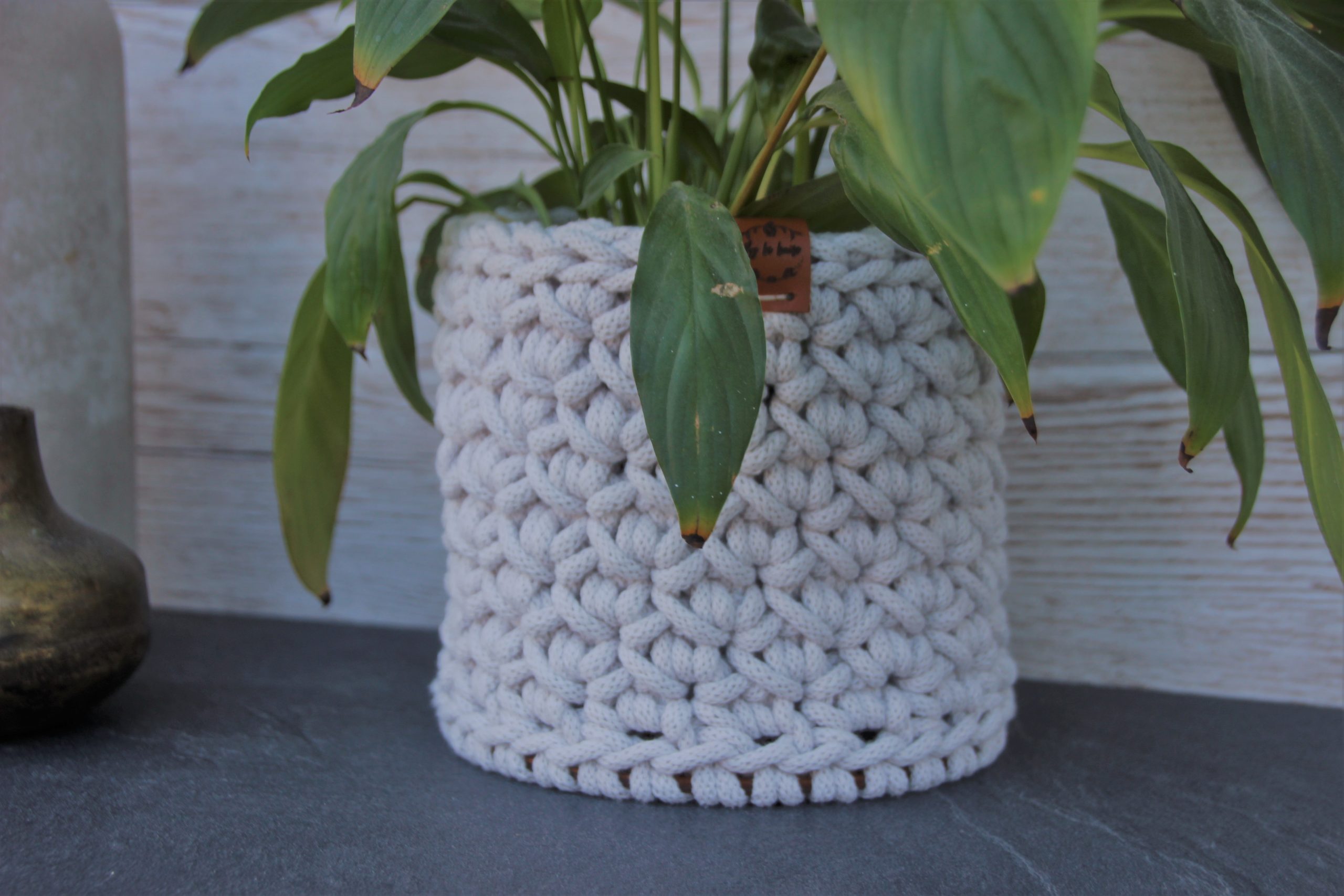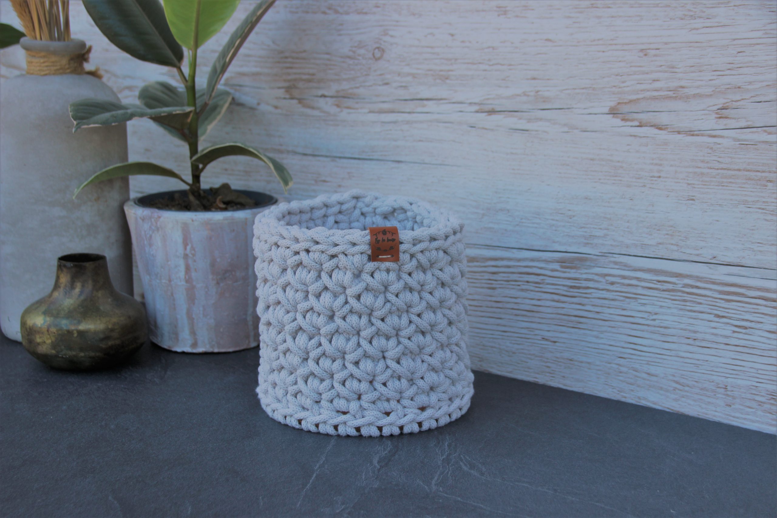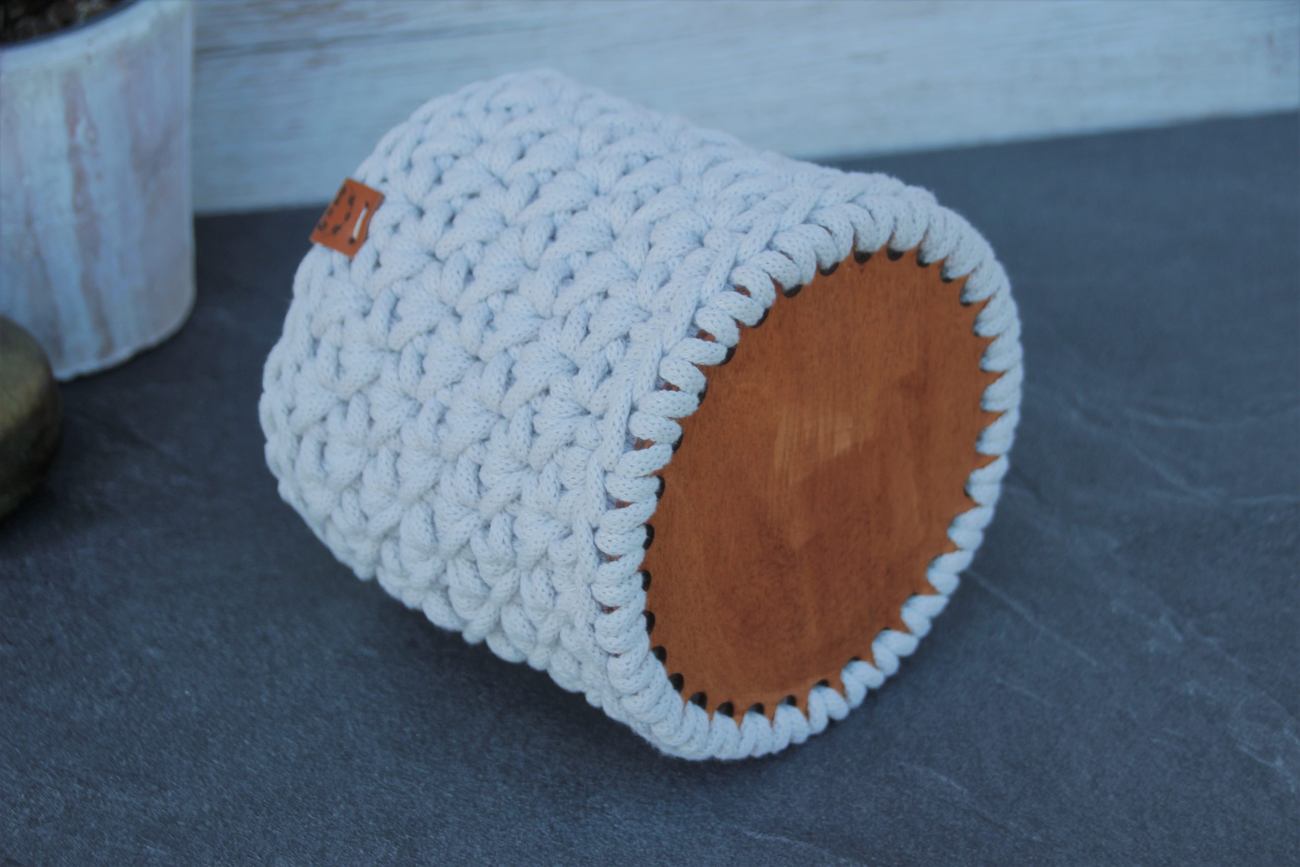 Cache-pot ou panier rond, en coton recyclé certifié OEKO-TEX, entièrement crocheté par mes soins, avec un fond en bois rigide.