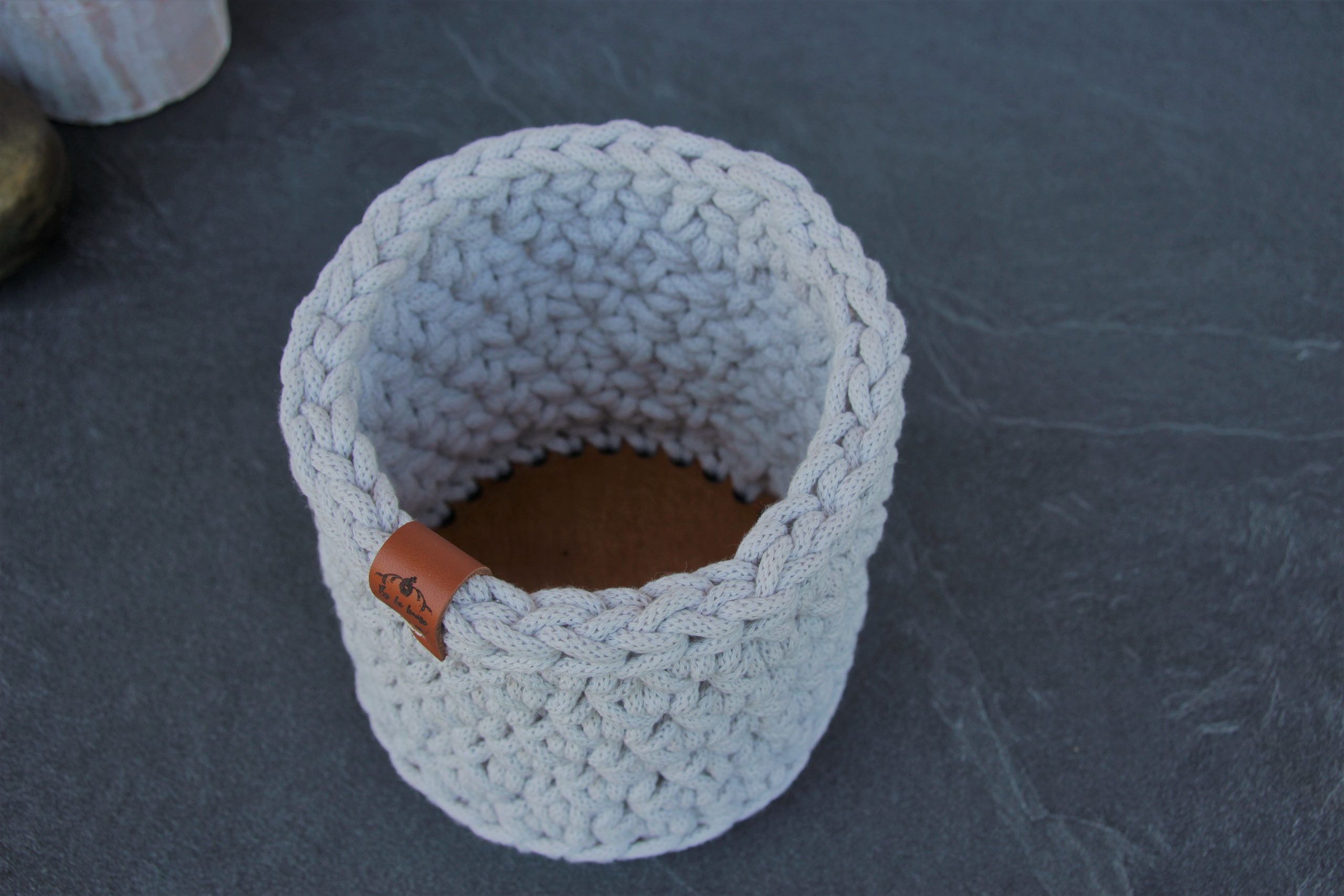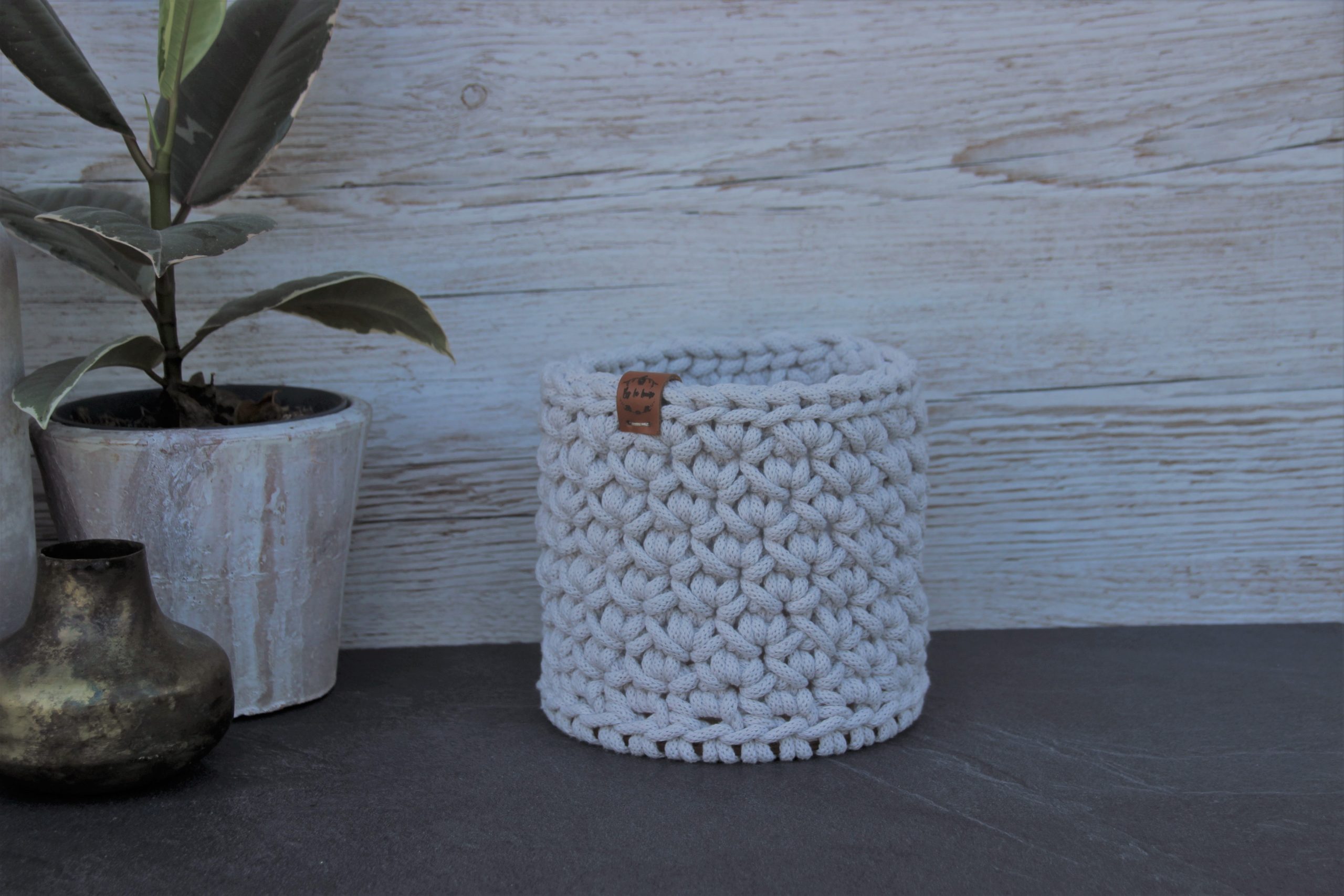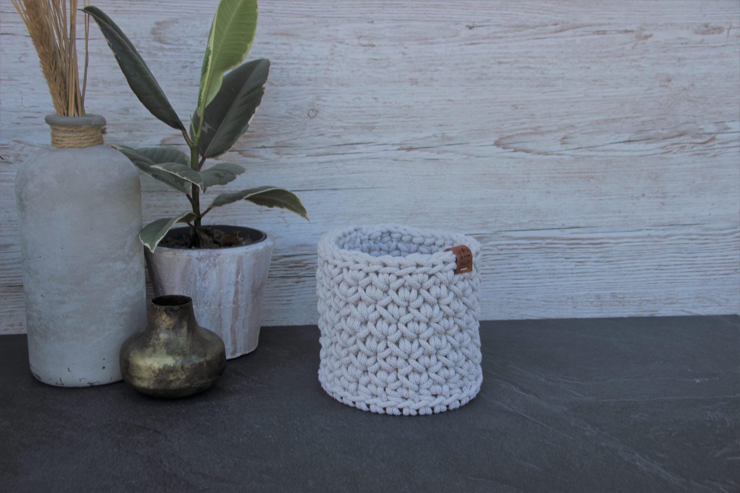 Cache-pot ou panier rond, en coton recyclé certifié OEKO-TEX, entièrement crocheté par mes soins, avec un fond en bois rigide.