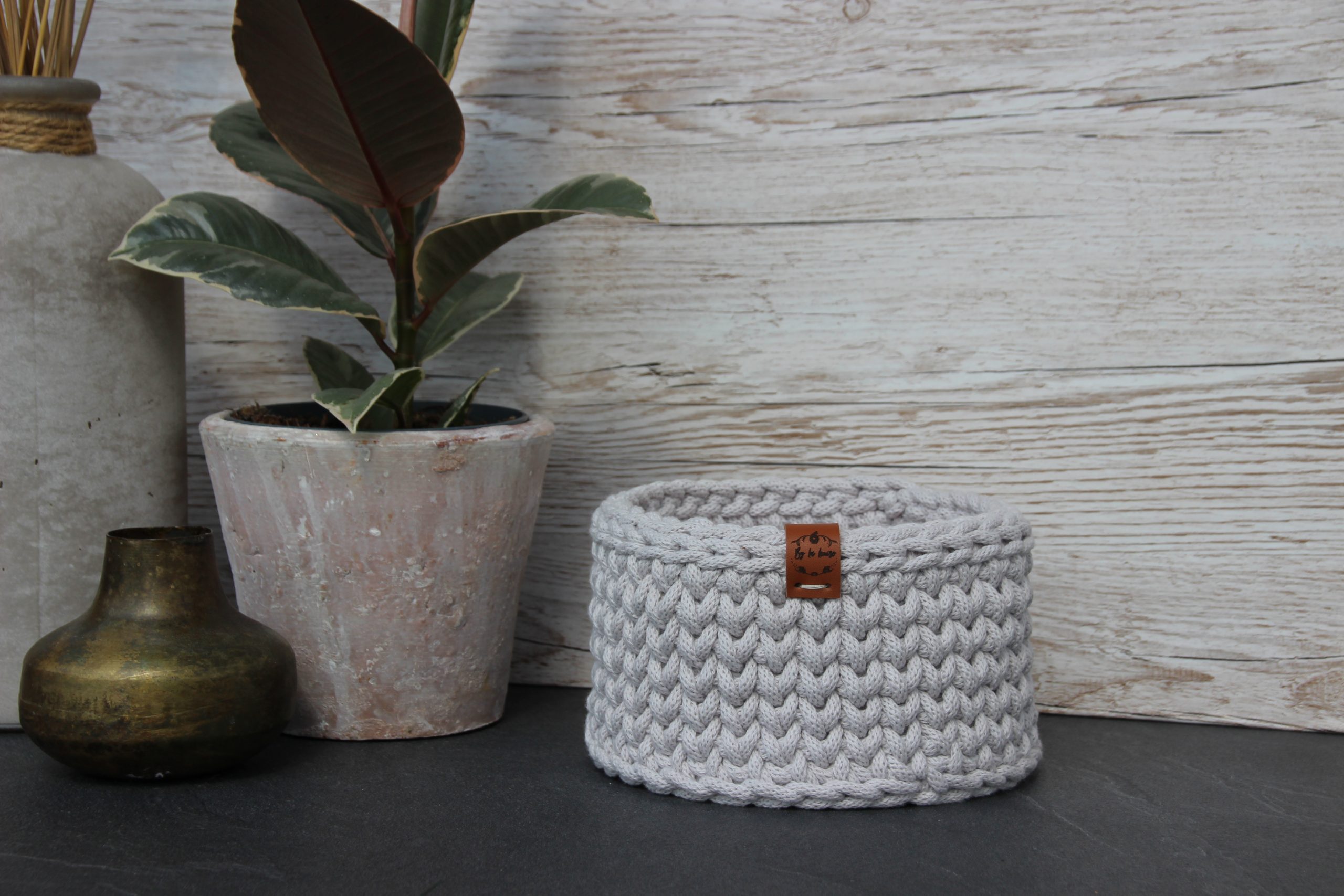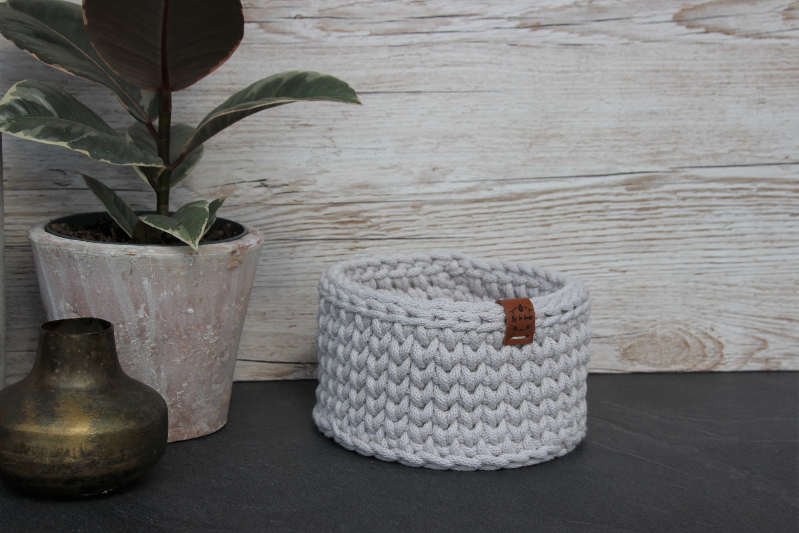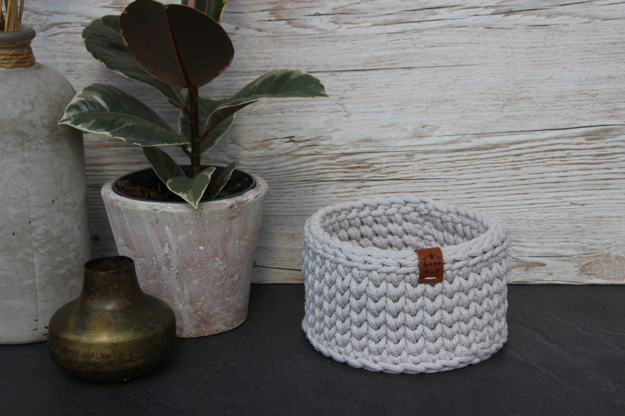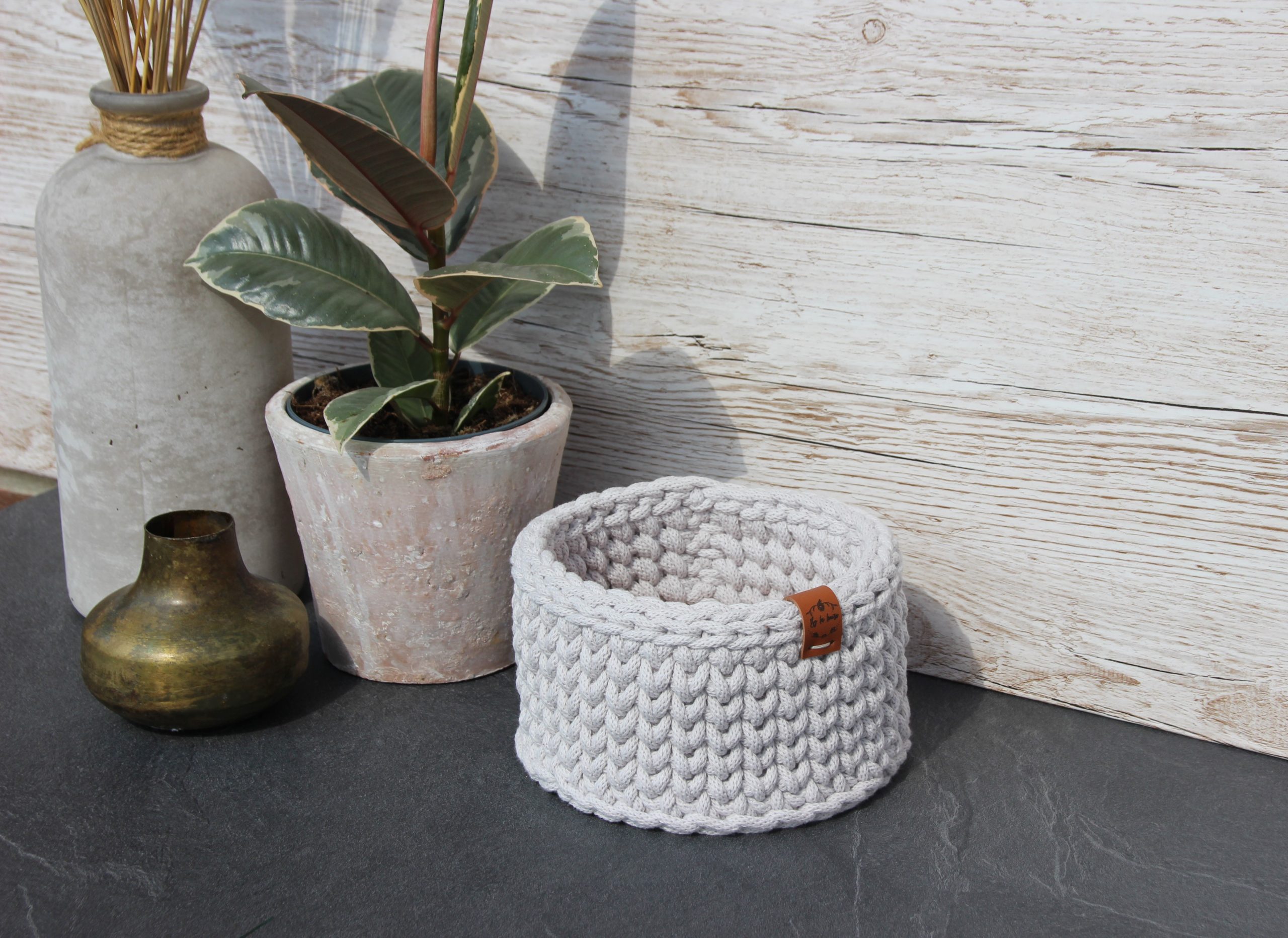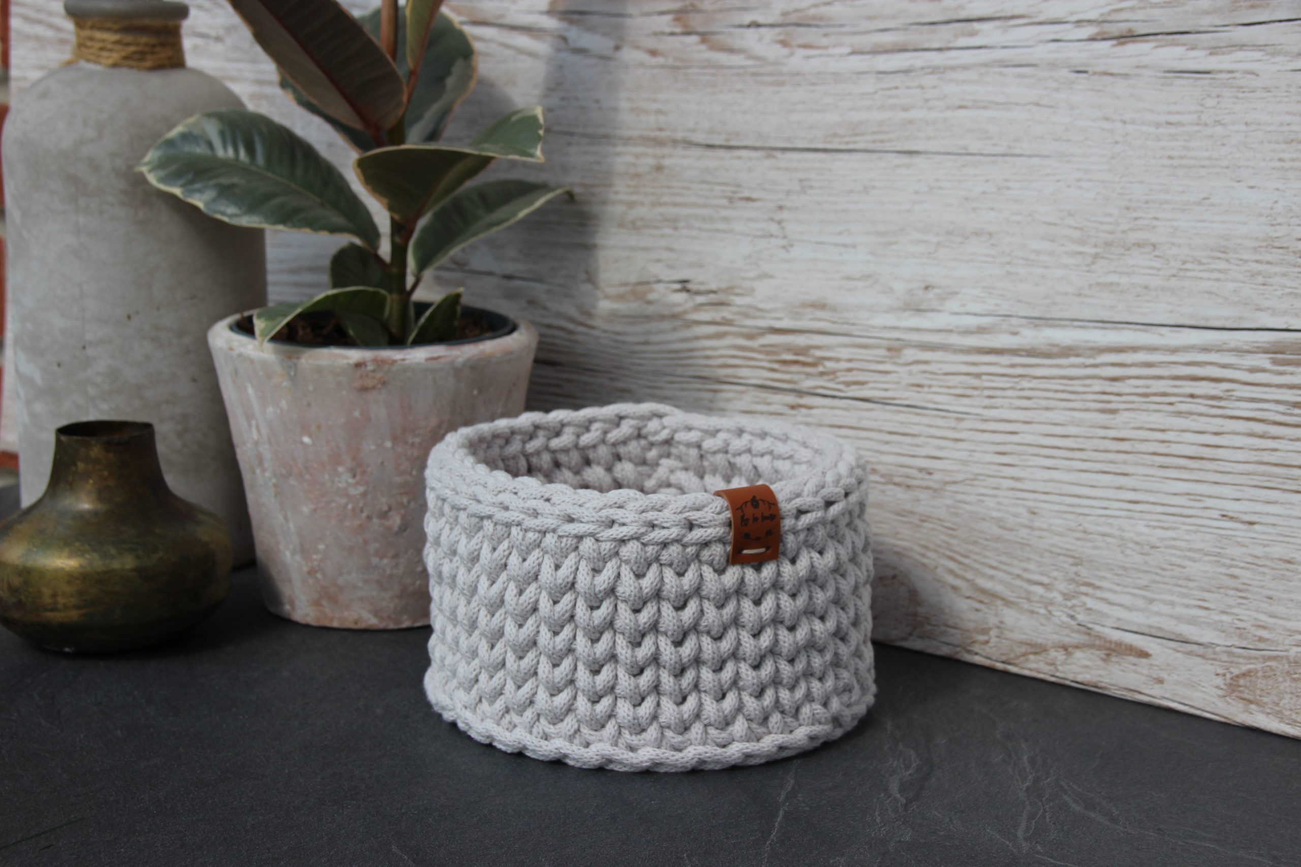 Petit panier rond, en coton recyclé certifié OEKO-TEX, entièrement crocheté par mes soins, avec un fond en bois rigide.