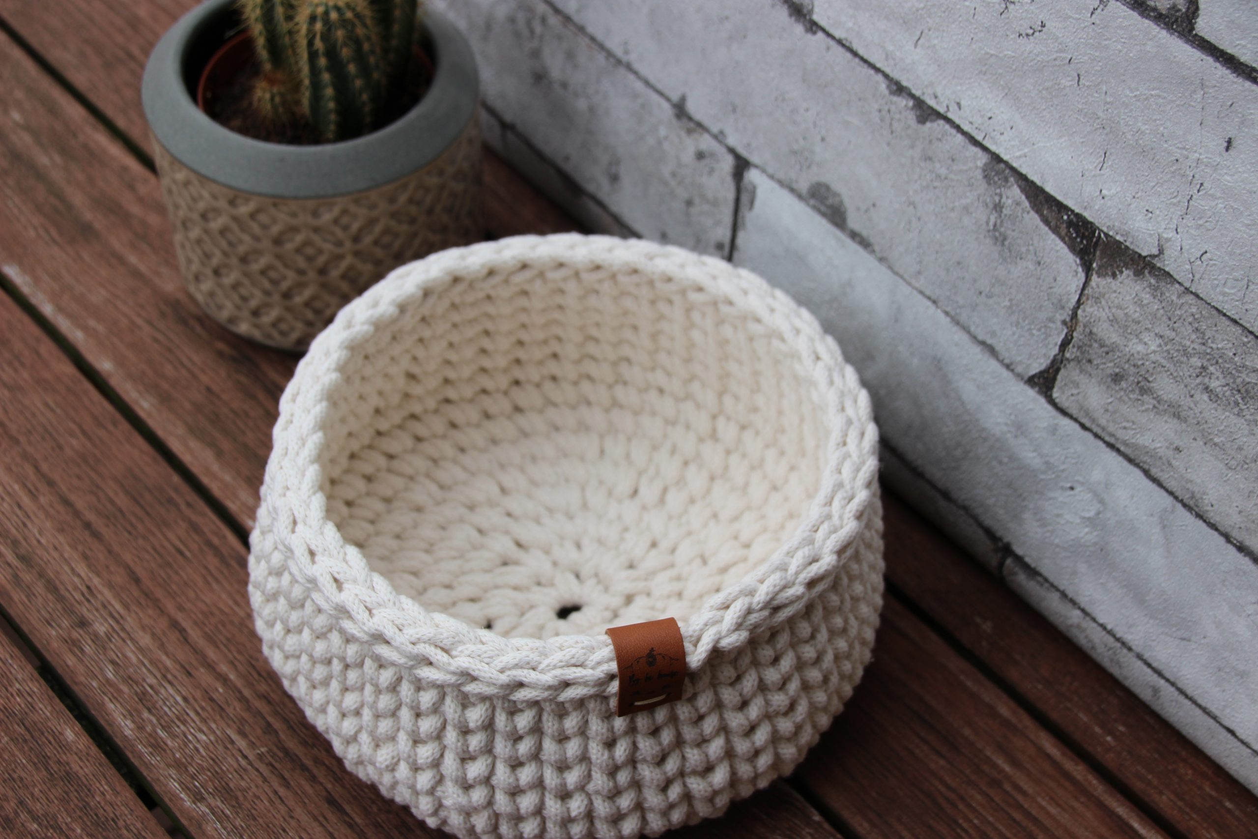 Petit panier rond, en coton recyclé certifié OEKO-TEX, entièrement crocheté par mes soins.