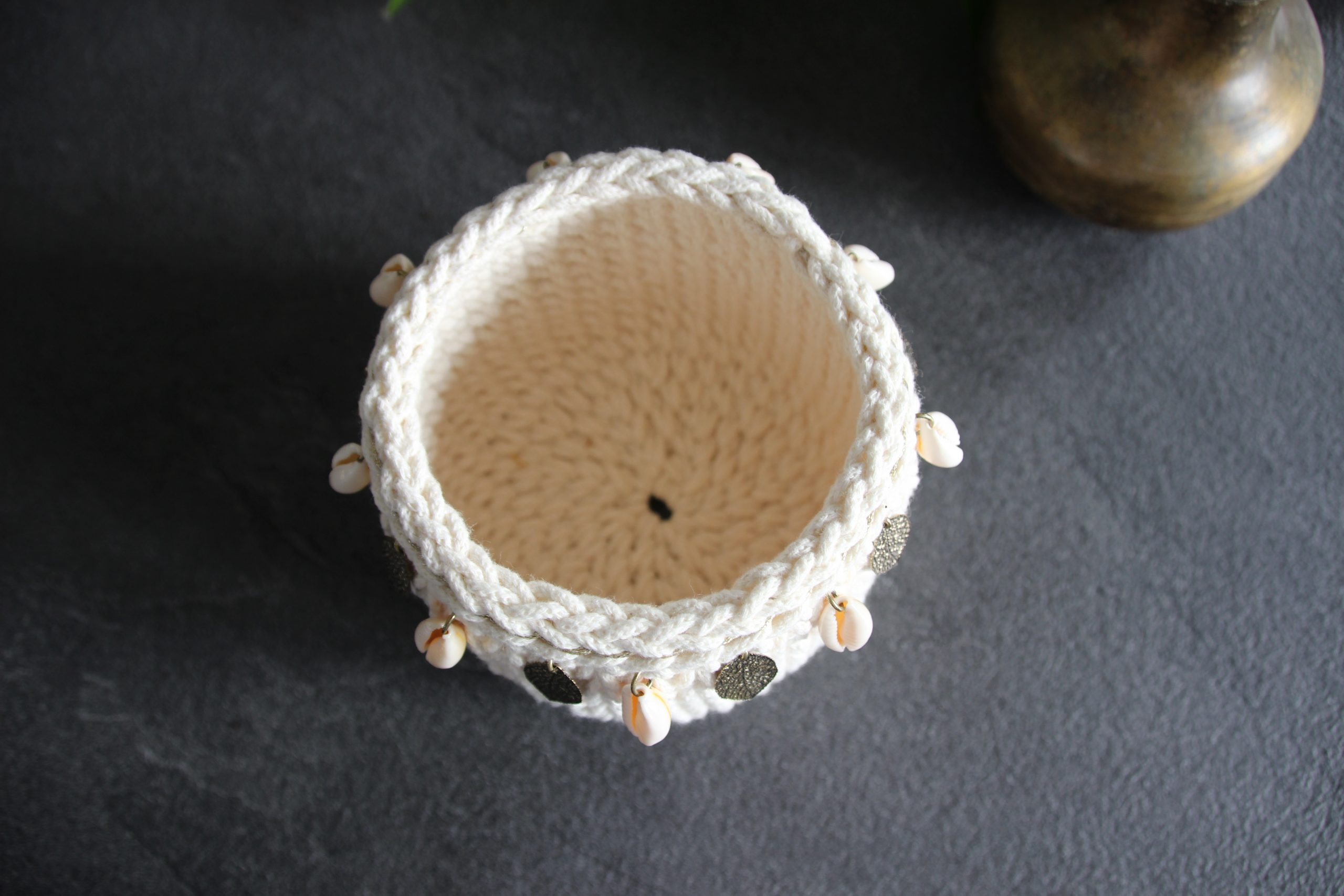 Petit panier rond, de style bohème chic, en coton recyclé certifié OEKO-TEX de couleur blanc cassé, entièrement crocheté par mes soins.