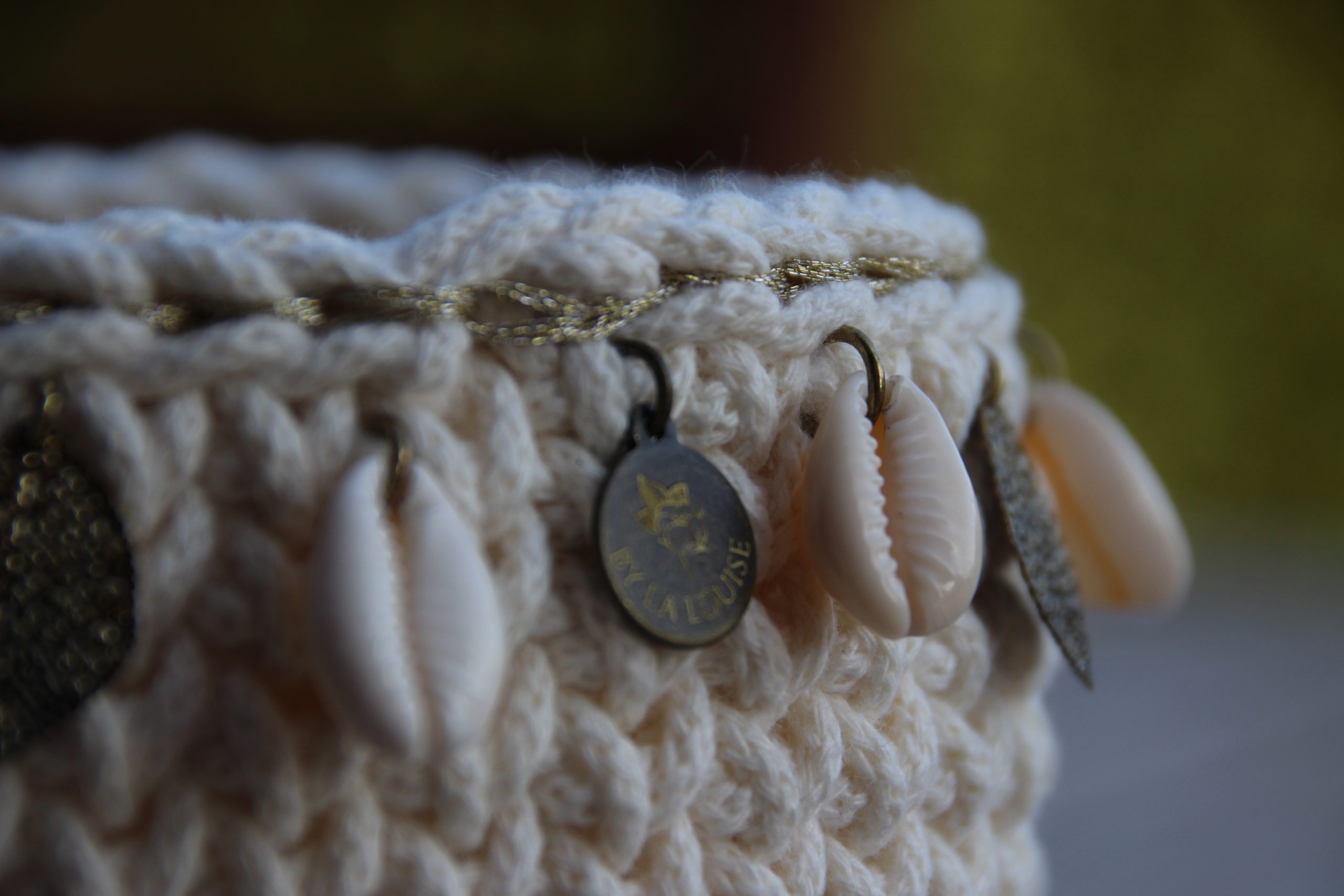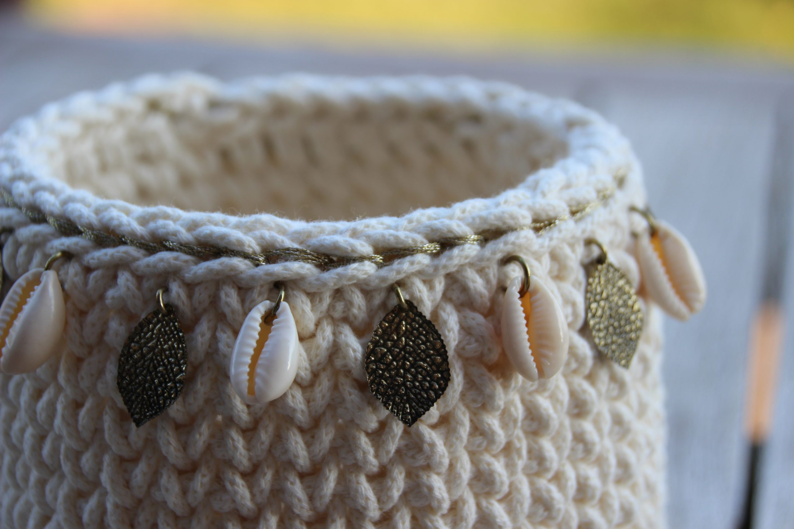 Le panier est décoré en partie haute de véritables coquillage cauris, et de petites breloques en laiton doré, en forme de feuilles nervurées.