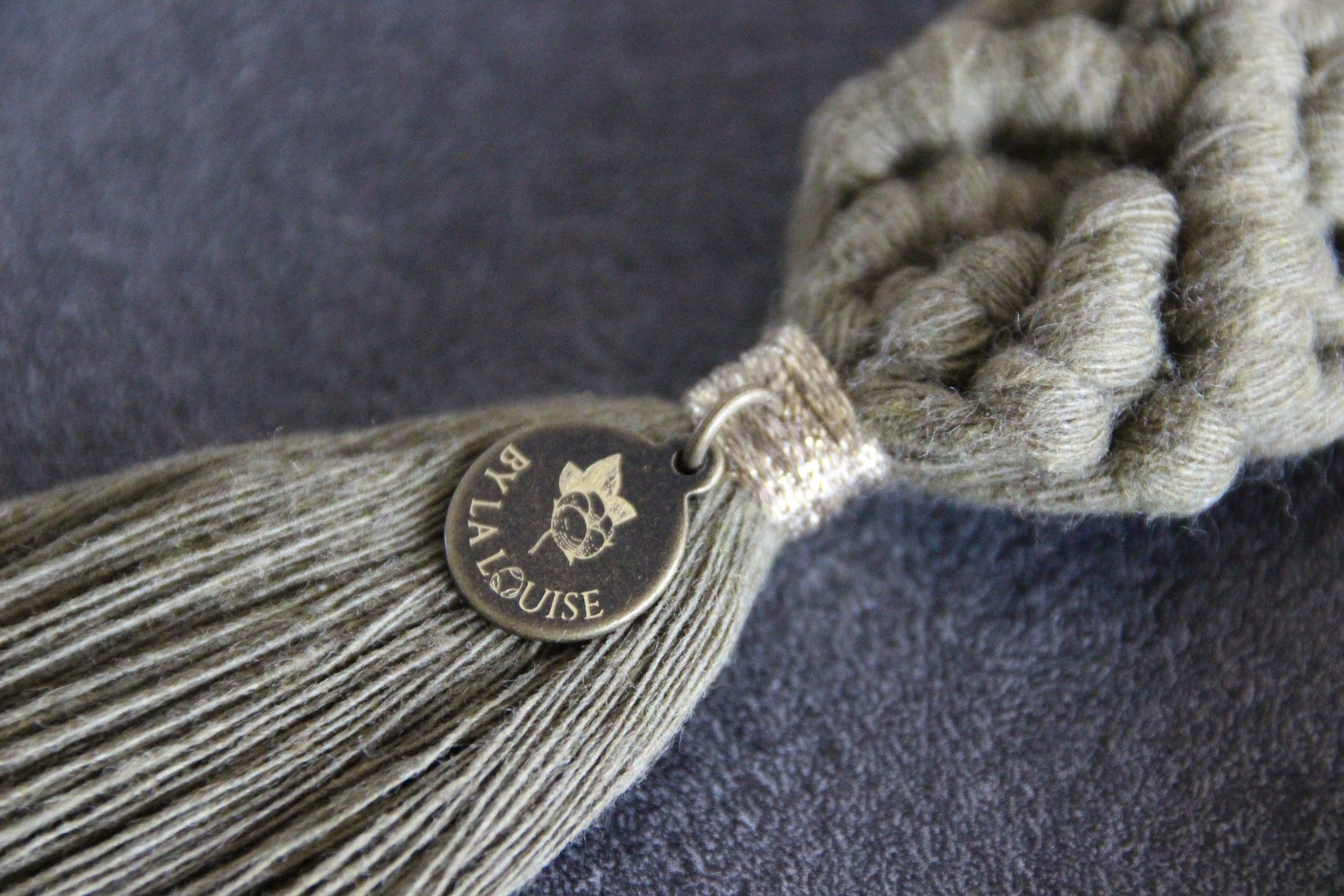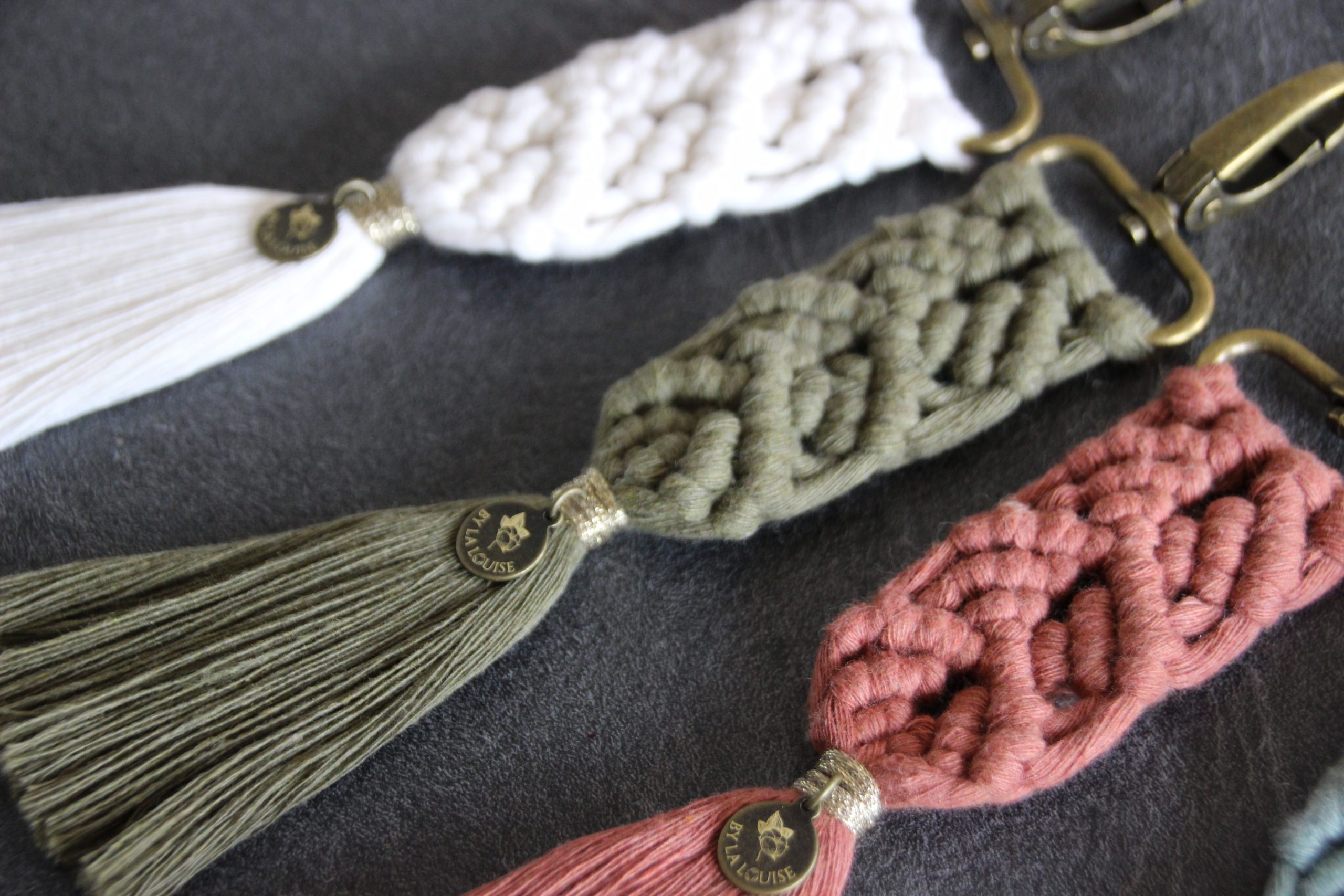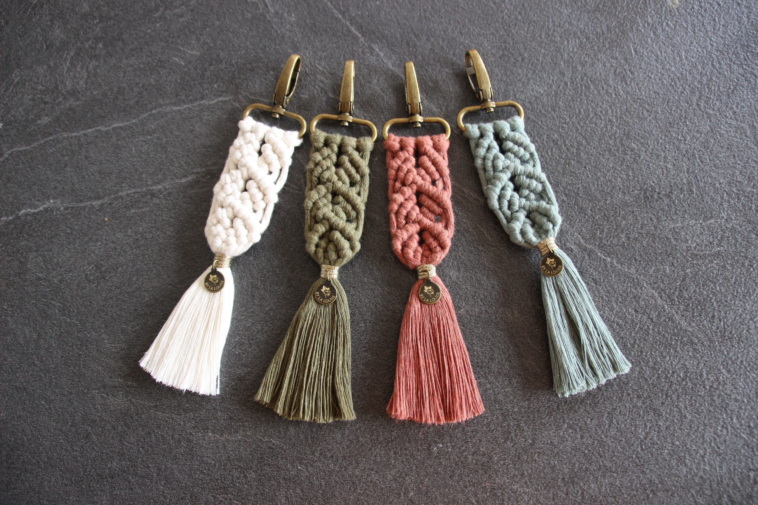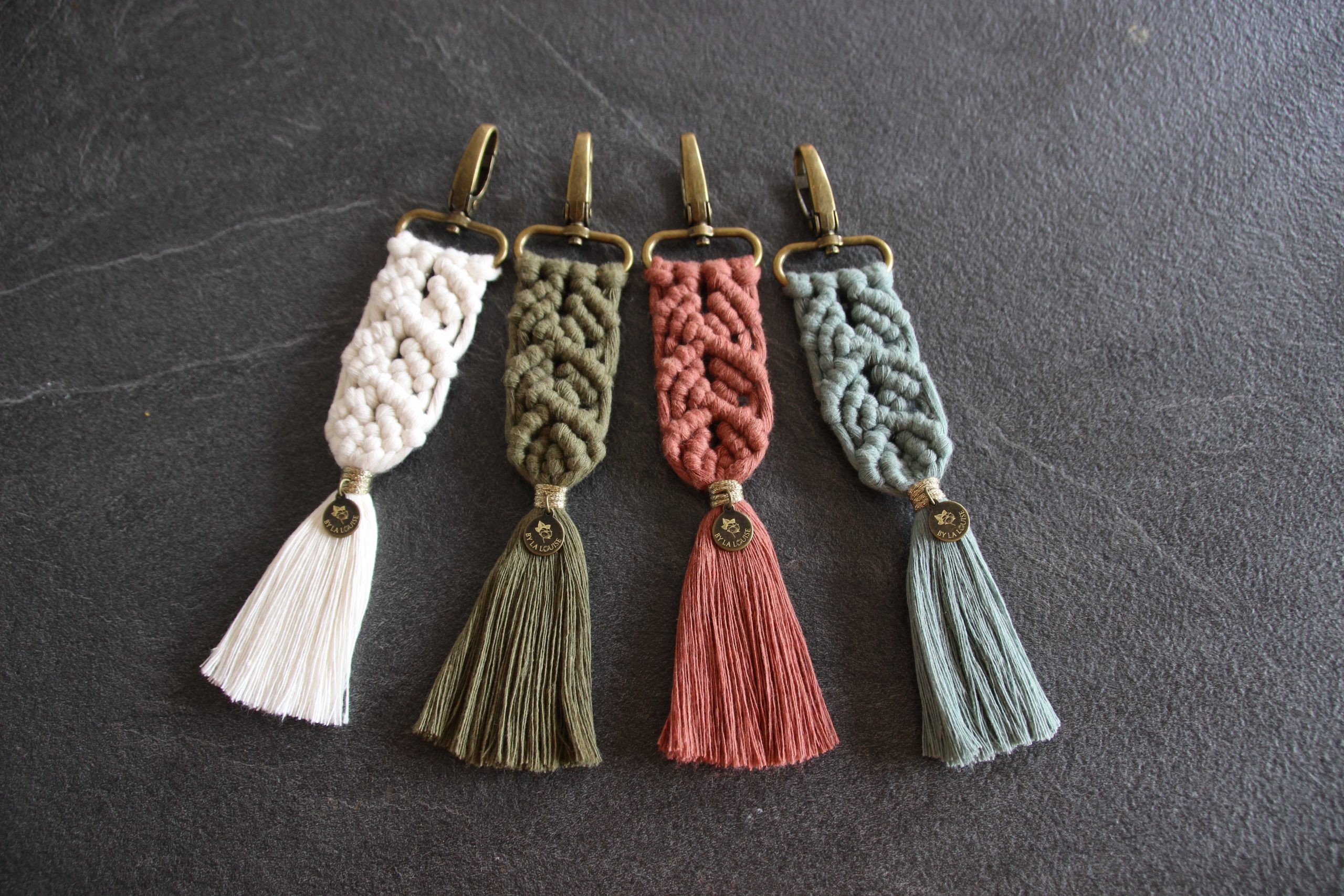 Porte-clés mousqueton en macramé au style bohème, entièrement réalisé par mes soins, avec du coton recyclé certifié oeko-tex,
