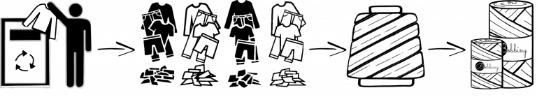 Les cordes Bobbiny sont fabriqués à partir de matériaux considérés comme usés ou en fin de vie. Le textile recyclé à partir duquel le fil est fabriqué provient des chutes de productions d’usines ainsi que des consommateurs (vous !) sous forme de vêtements usagés et autres textiles en coton.